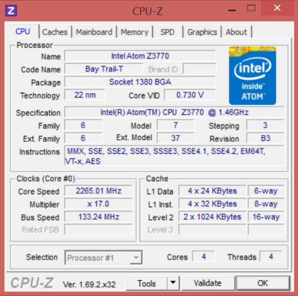 Gegenüber dem weitverbreiteten Intel Atom Z3740 bietet der Atom Z3770 einen deutlich gesteigerten Boost-Takt. Statt auf 1,86 GHz können Kerne bis auf 2,39 GHz beschleunigt werden. Auch der Basistakt fällt mit 1,46 GHz gegenüber 1,33 GHz höher aus. Die Intel HD Graphics taktet hingegen bei beiden SoCs mit 311 (Basistakt) bzw. 667 Mhz (Boosttakt). Der nominell erhöhte Boost-Takt der CPU-Kerne muss aber nicht zwangsläufig zu einer deutlichen Leistungssteigerung führen. Bei hoher Last (beispielsweise durch Stress-Tools wie Prime 95) muss der Atomprozessor häufig gedrosselt werden und fällt dann phasenweise auf den Basistakt zurück.