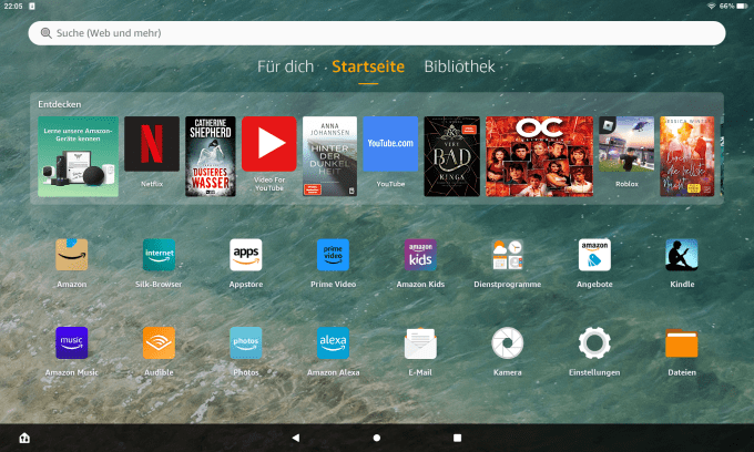 Das Potenzial der optionalen Eingabegeräte lässt Amazon so auf Softwareseite etwas brachliegen. Das ist umso bedauerlicher, weil sowohl Tastaturhülle als auch Eingabestift durchaus überzeugen können. Eigentlich wären sie geeignete Zubehörartikel, um das Fire Max 11 sowohl produktiver als auch kreativer zu nutzen. Mit der Tastaturhülle erinnert das Fire Max 11 vom Handling her etwas an ein Surface Pro. Der Tastaturteil wird ebenfalls über Pogo-Pins verbunden. Und die rückseitige Hülle bietet einen praktischen, stufenlos verstellbaren Kickstand. Doch wegen den werkseitigen Apps und den Einschränkungen des Appstores ist das Amazon-Tablet letztlich doch weiterhin in erster Linie für den Content-Konsum ausgelegt. Das unterstreicht nicht zuletzt auch die prominente Einbettung von Content und Contentanbietern in Fire OS.
