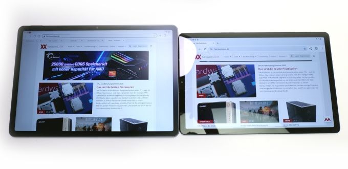 Nur bei der PaperMatte-Variante erfolgt während der Fertigugn eine nanostrukturierte Anti-Reflexionsätzung, die das Display matt macht. Der direkte Vergleich mit einem Tablet mit spiegelndem Display zeigt den massiven Unterschied: Während im spiegelnden Display die Fotolampen deutlich sichtbar sind und z.B. beim Lesen stören würden, sind sie im PaperMatte-Display nicht zu sehen. Matte Display streuen das Licht - was allerdings auch Nachteile hat. So können Farben weniger lebendig wirken und der Kontrast geringer ausfallen.