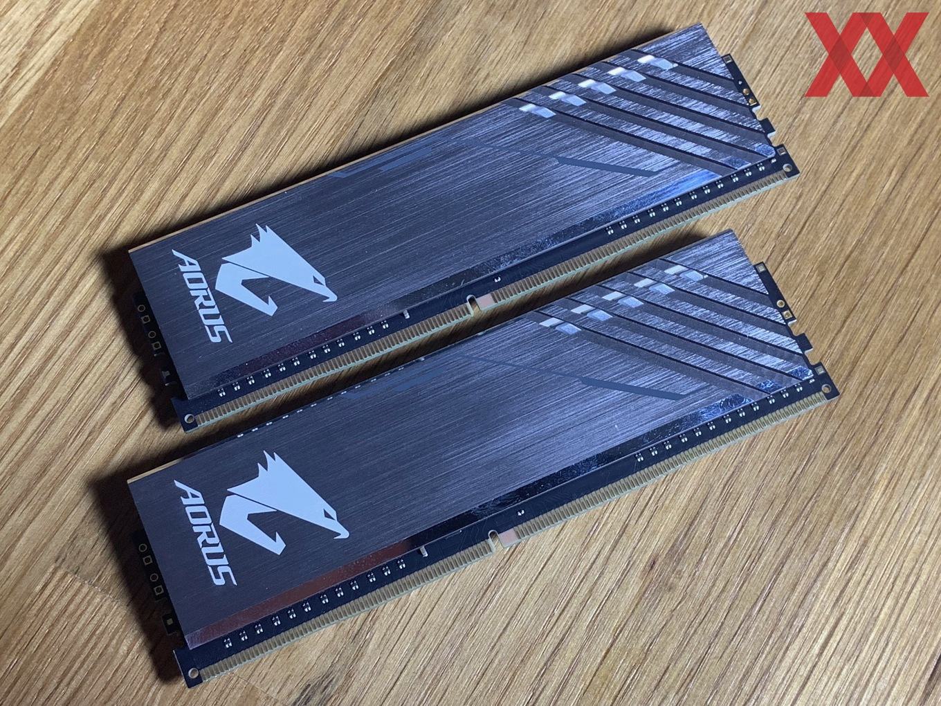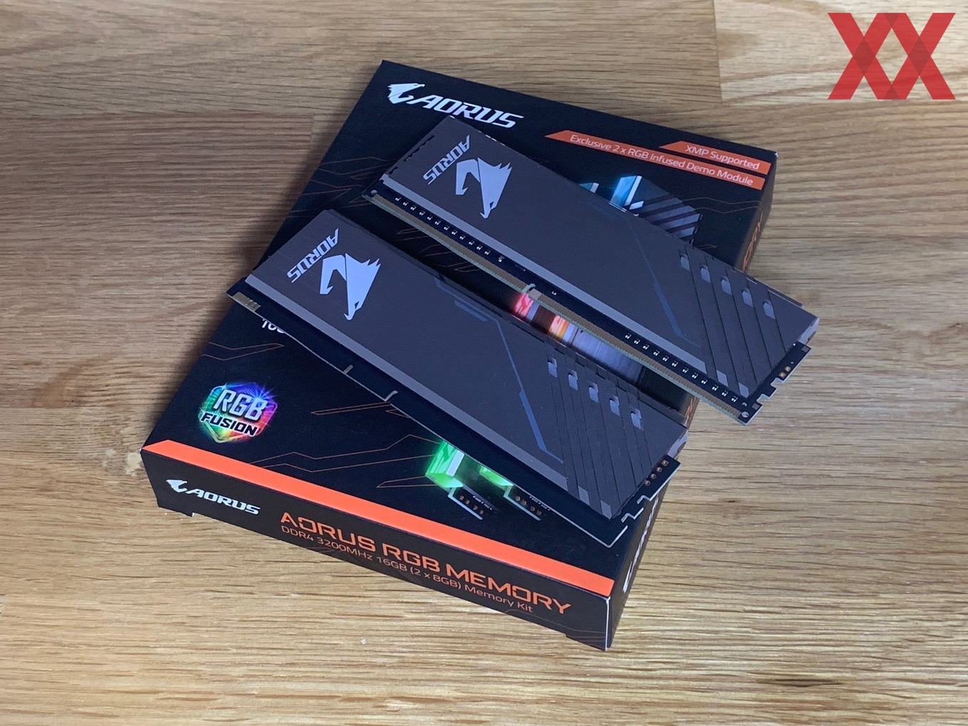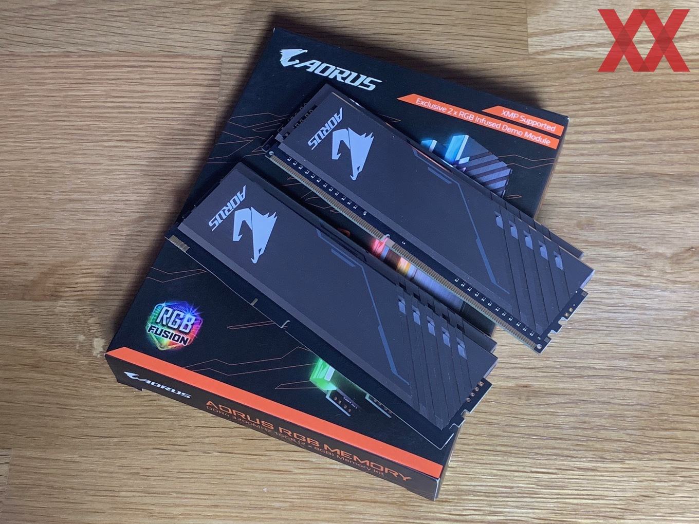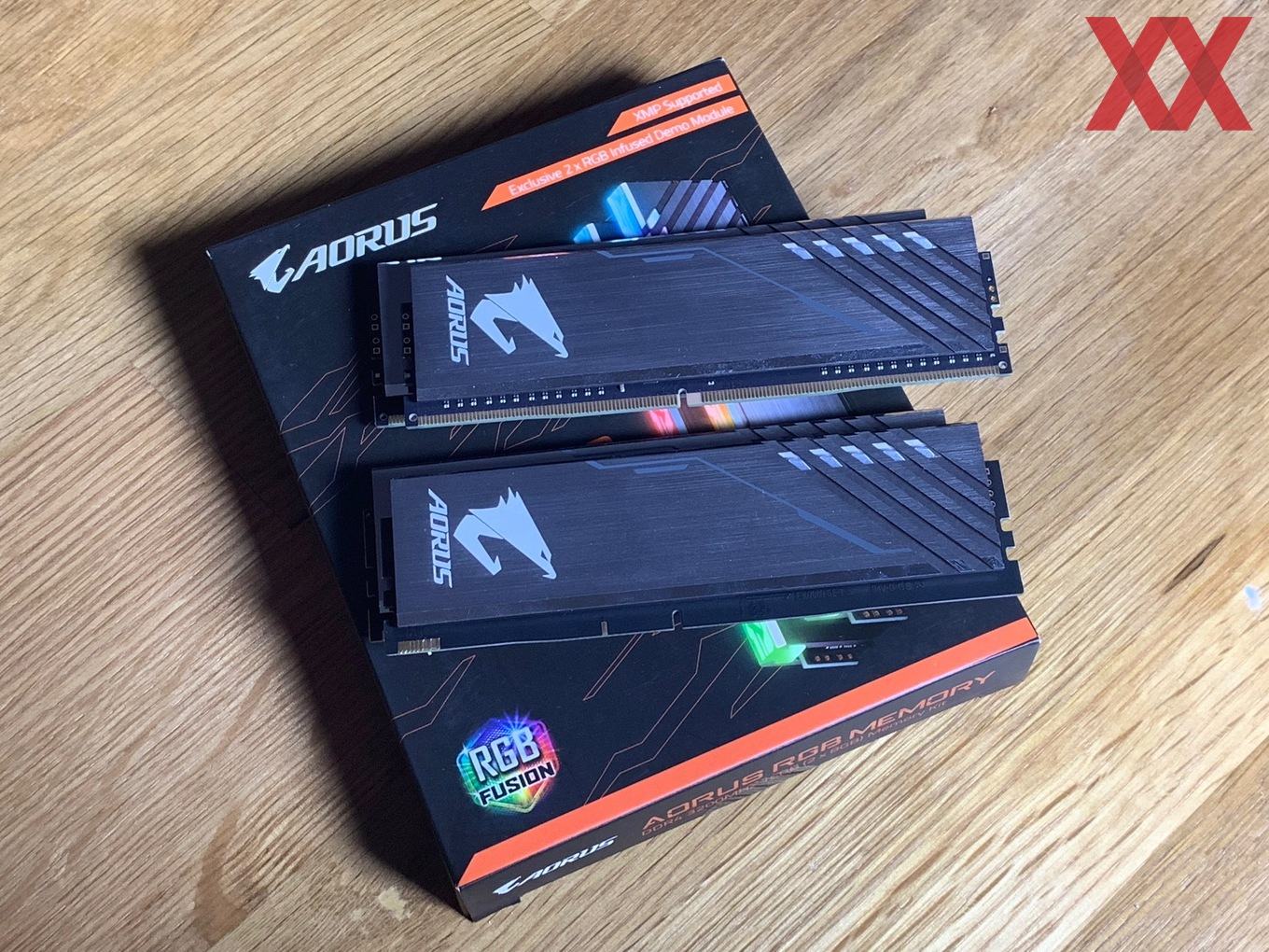 Im Vergleich zu den anderen Herstellern startet Gigabyte zunächst einmal mit wenigen Kits: Das uns vorliegende DDR4-3200-Kit ist das "größte", nämlich nicht nur mit RGB, sondern auch noch mit zwei Speicherdummys, die sich in die freien Speicherslots einsetzen lassen. Bei einem 2x8-GB-Kit hat man dann bei einem Z390-Mainboard nicht das Problem, dass freie Speicherbänke zu sehen sind, sondern kann die Dummys dazwischensetzen. Sie werden auch mit Spannung versorgt und die RGB-Beleuchtung ist auch ansprechbar, insofern wirkt es, als hätte man vier Speichermodule im System.
