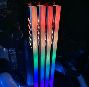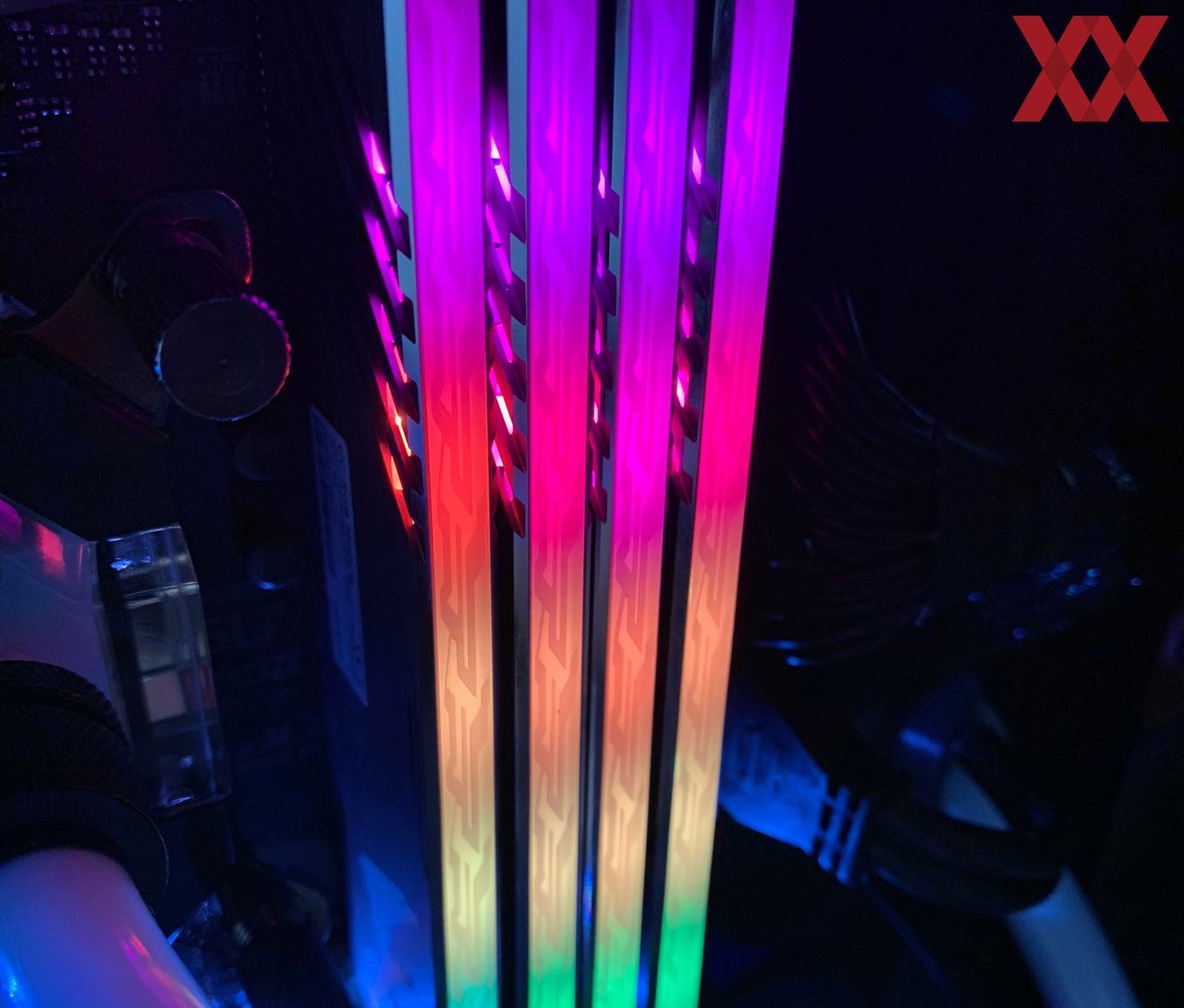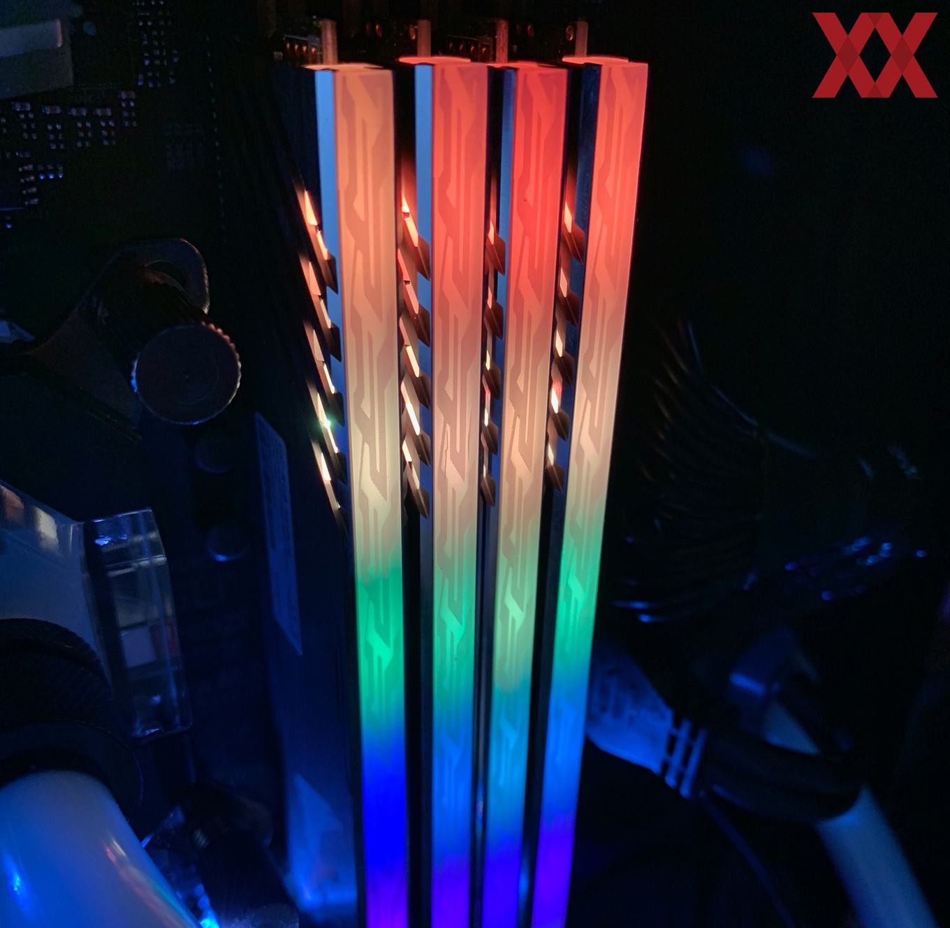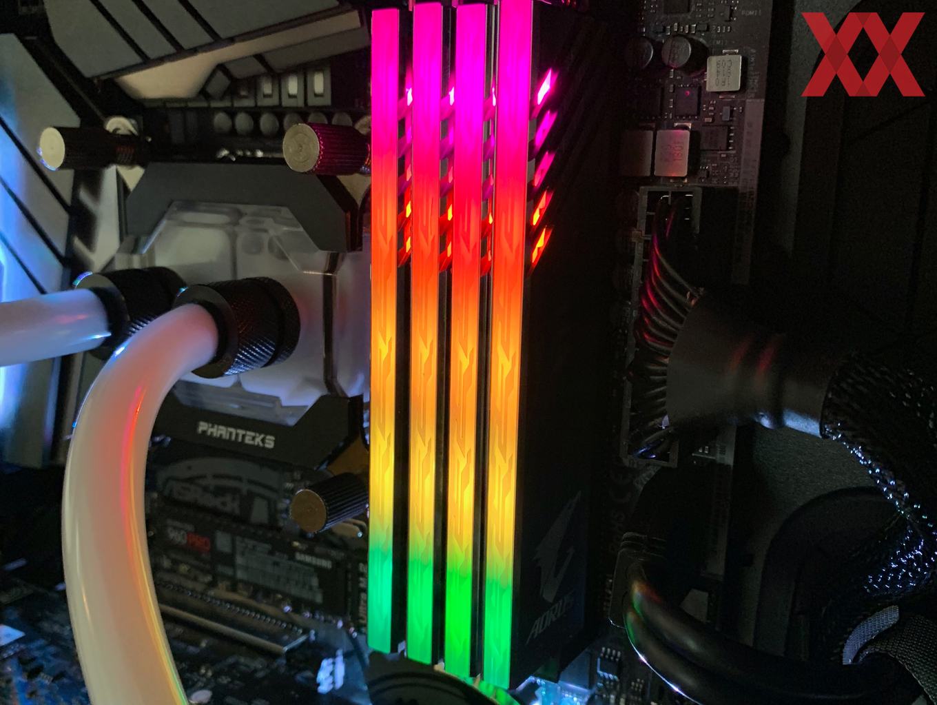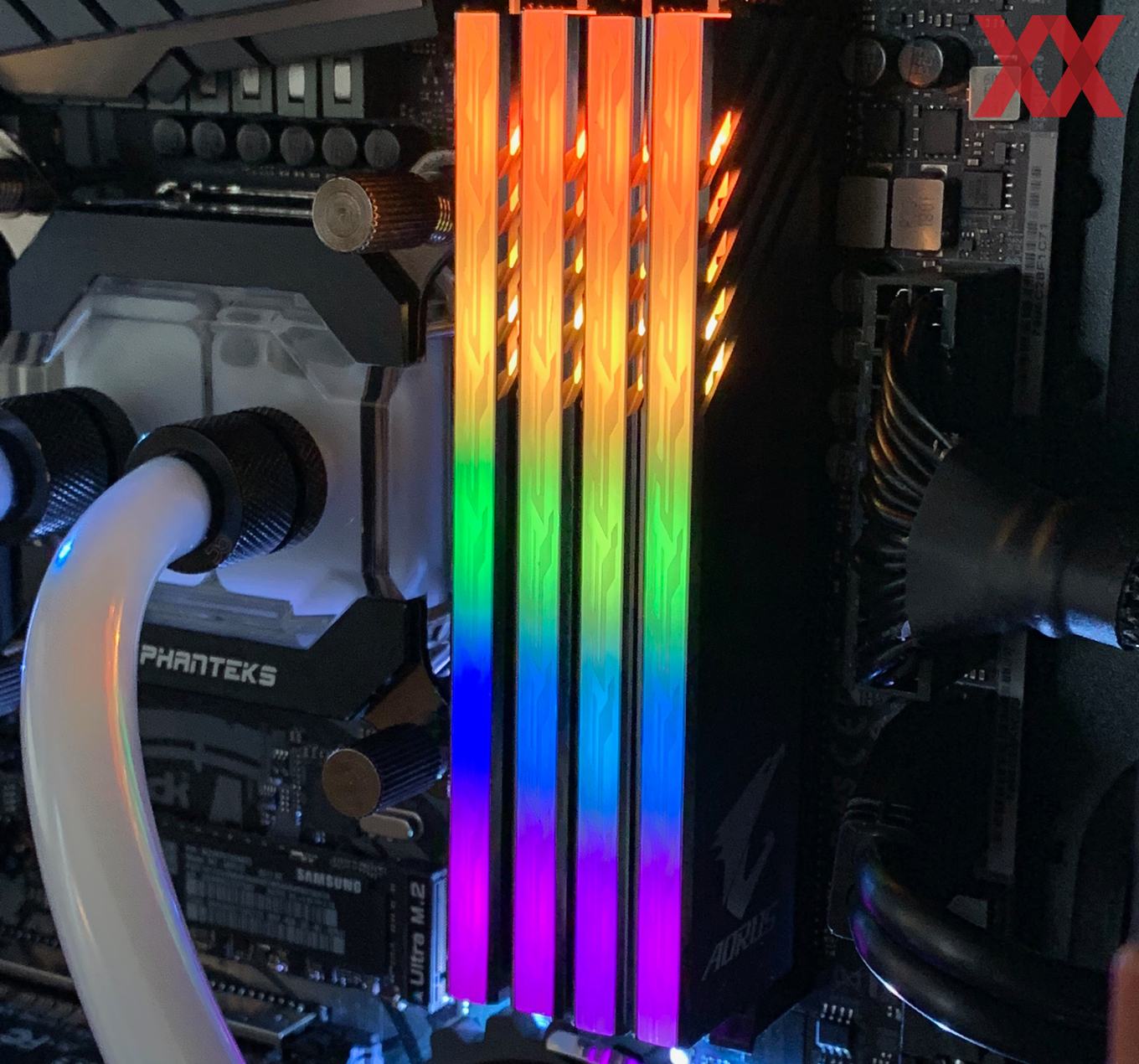 Im Vergleich zu den anderen Herstellern startet Gigabyte zunächst einmal mit wenigen Kits: Das uns vorliegende DDR4-3200-Kit ist das "größte", nämlich nicht nur mit RGB, sondern auch noch mit zwei Speicherdummys, die sich in die freien Speicherslots einsetzen lassen. Bei einem 2x8-GB-Kit hat man dann bei einem Z390-Mainboard nicht das Problem, dass freie Speicherbänke zu sehen sind, sondern kann die Dummys dazwischensetzen. Sie werden auch mit Spannung versorgt und die RGB-Beleuchtung ist auch ansprechbar, insofern wirkt es, als hätte man vier Speichermodule im System.