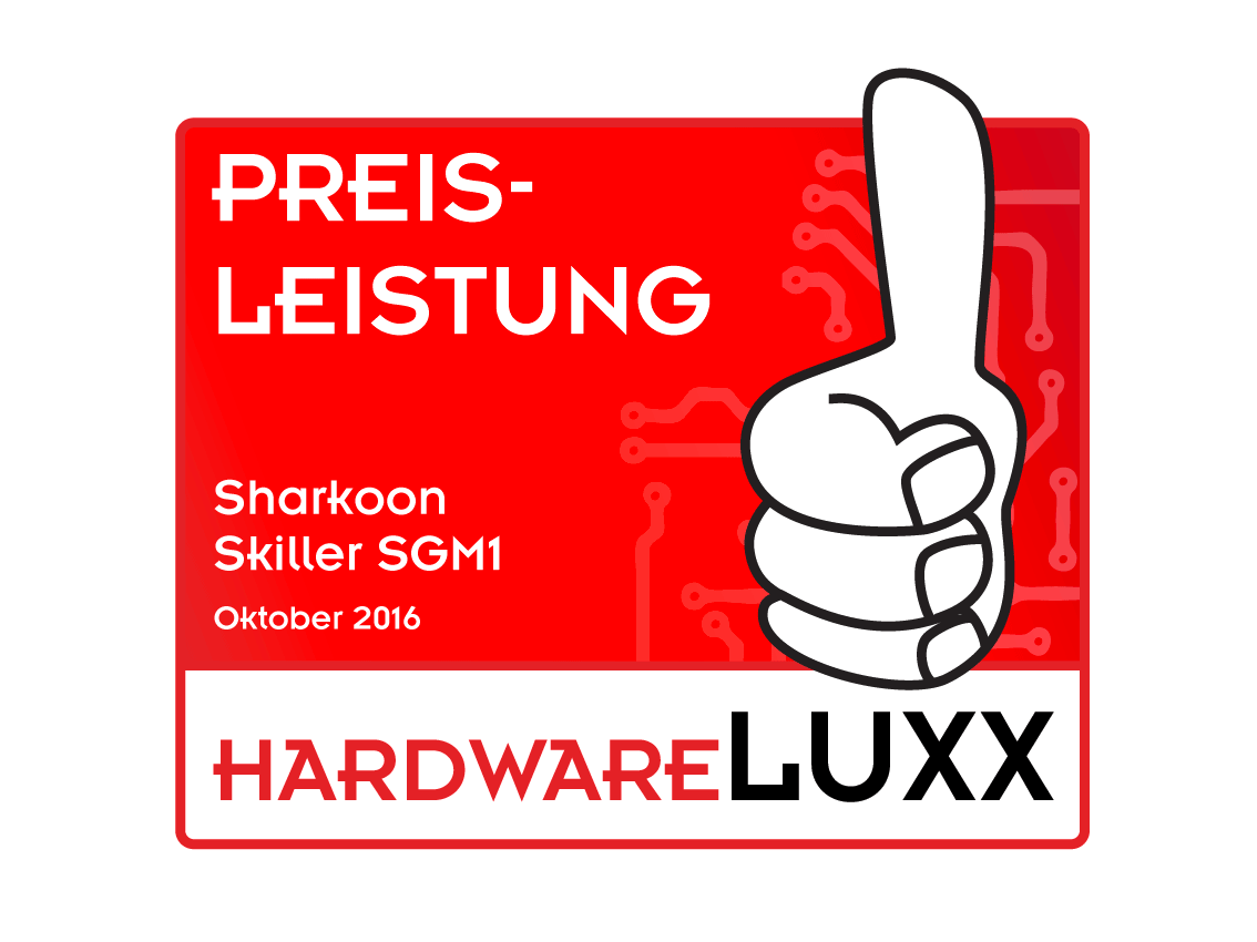 Sharkoon hat nicht nur so ziemlich alle Haken an die Featureliste gesetzt, sondern mit der Skiller SGM1 auch eine stimmige Allround-Maus entwickelt. Weil sie dabei keine 40 Euro kostet, zücken wir unseren Preis-Leistungs-Award.