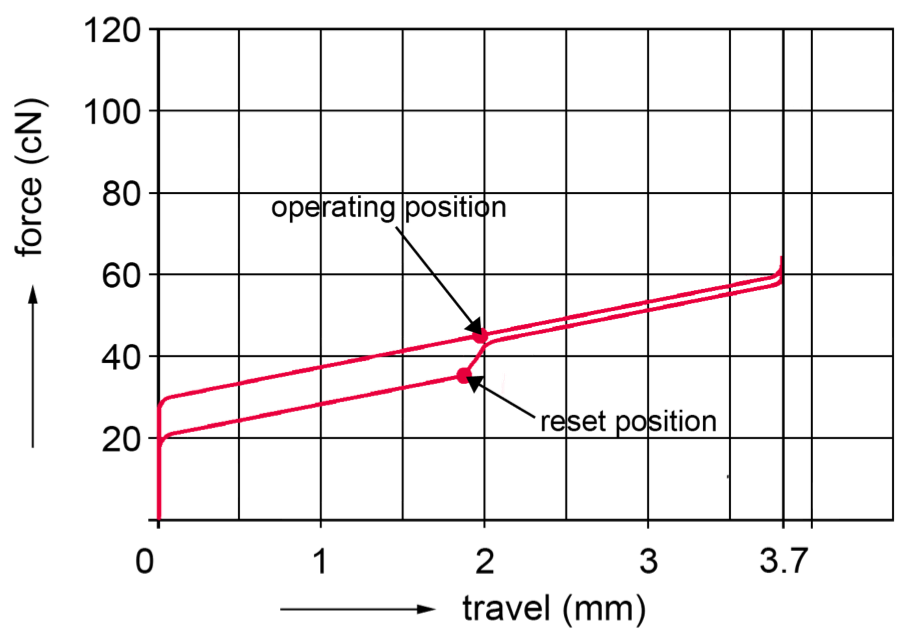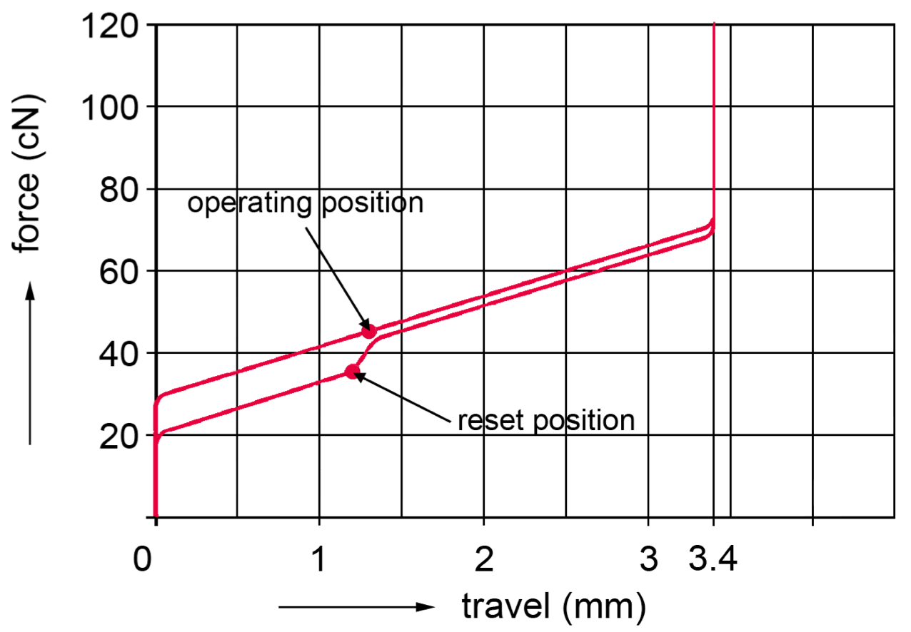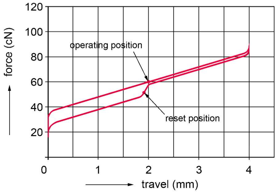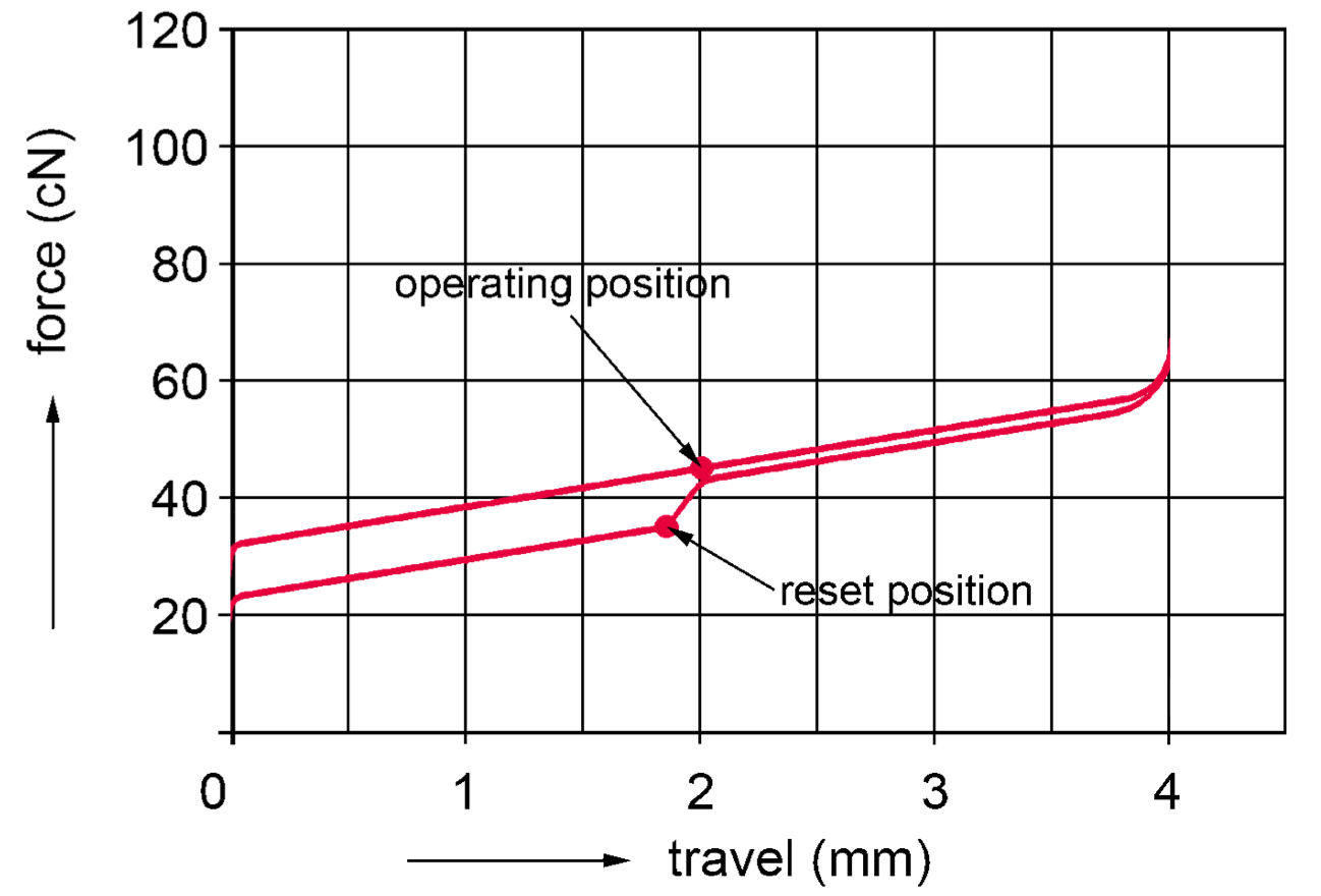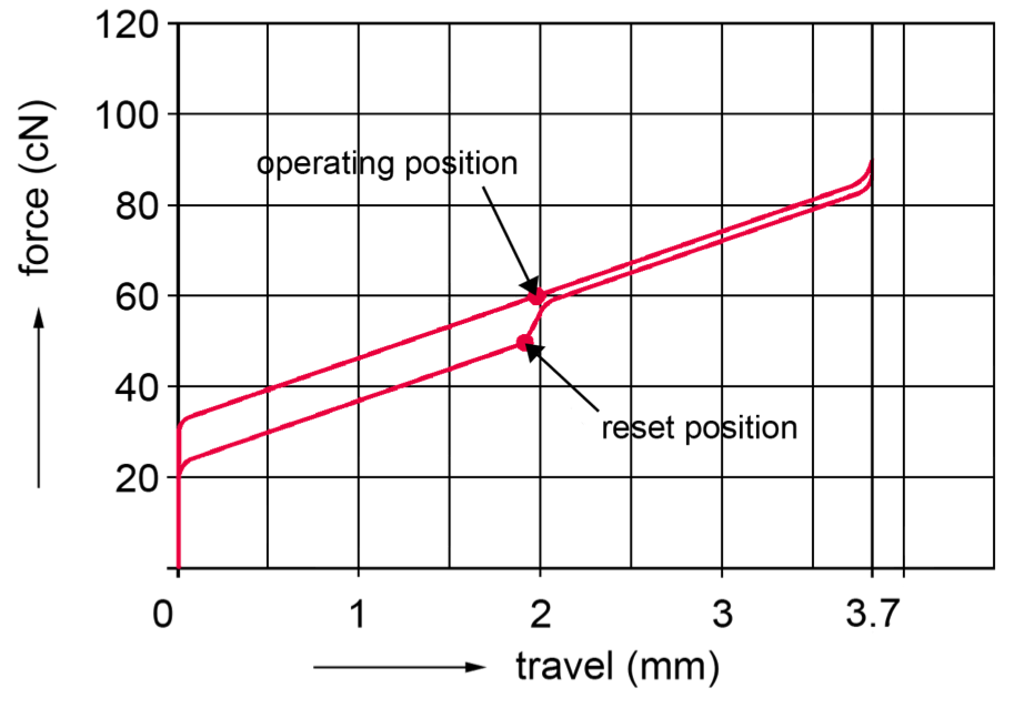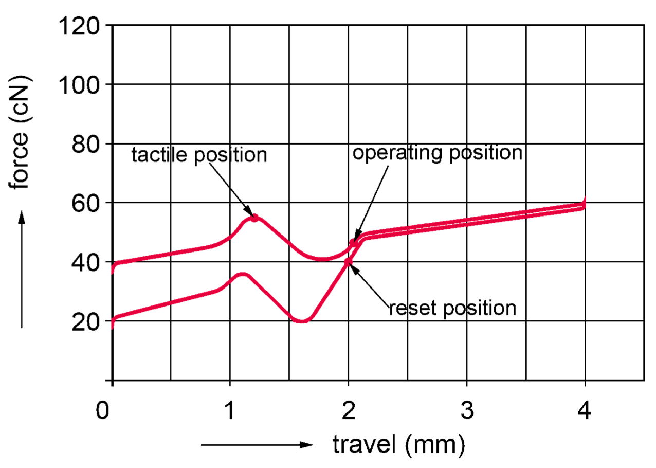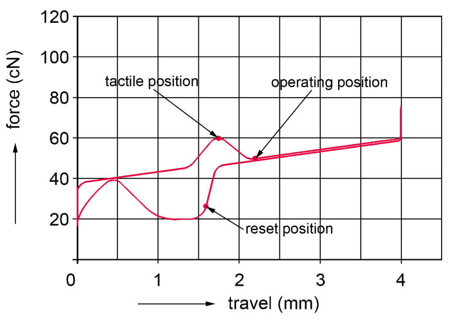 Es muss zunächst eine Anfangskraft von 30 cN überwunden werden, die Druckpunktkraft liegt bei 55 cN, dann ist der taktile Punkt überwunden und der Schalter quittiert die Schließung und damit die Betätigung bei 45 cN. Im Diagramm ist dies sicherlich am besten zu erkennen: