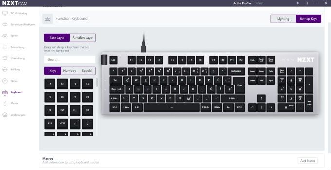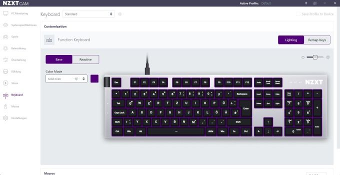 NZXT hat mit CAM schon länger eine eigene Software etabliert, die unter anderem zum Systemmonitoring genutzt werden kann. Sie kann jetzt aber auch für Anpassungen an den Function-Tastaturen und der NZXT-Maus Lift genutzt werden. So lassen sich verschiedene Beleuchtungsmodi auswählen und die Helligkeit auch in der Software anpassen.
