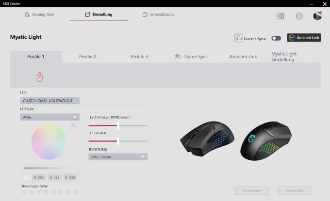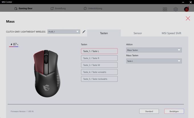 MSI setzt als Software-Lösung auf das MSI Center. Zum Testzeitpunkt unterstützte nur eine Beta-Version die beiden neuen Mäuse. Dabei hatten wir noch mit Problemen zu kämpfen. So wollte die Software andauernd ein Firmware-Update der Clutch GM51 Lightweight vornehmen - nur um nach erfolgtem Update erneut den Update-Hinweis einzublenden. Auf dem Testsystem verhielt sich die Software zudem etwas träge. Prinzipiell bietet sie aber einen sinnvollen Funktionsumfang. So können die Tastenbelegungen angepasst werden. Bei der kabellosen Variante wird zudem über den Ladestand des Akkus informiert. Die Maus bietet drei interne Profile.