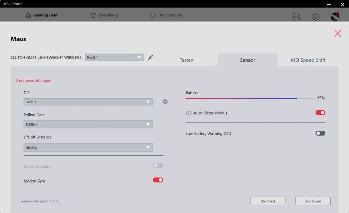 Im Sensor-Bereich sind unter anderem Anpassungen an DPI-Leveln, Abfragerate und Lift-Off Distance (LOD) möglich.
