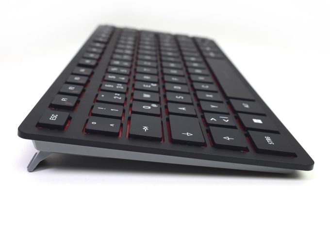Anstelle der mechanischen Cherry MX Ultra Low Profile verbaut Cherry bei diesem Modell nur SX-Switches, also die hauseigene Scissor-Technologie. Die angegebene Lebensdauer sinkt damit auf 10 Millionen Betätigungen. Eine sehr flache Bauform ist aber auch mit dieser günstigeren Lösung möglich. Dank der geringen Höhe ist die Tastatur auch ohne Handballenauflage komfortabel nutzbar.