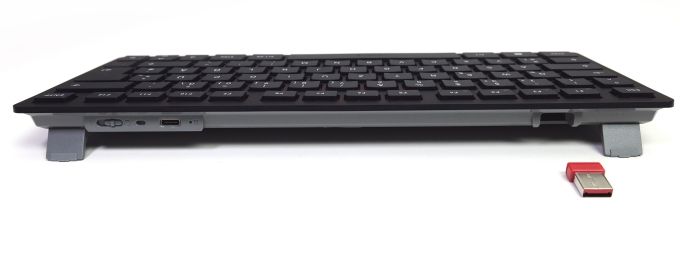 Der kompakte USB-Empfänger hält magnetisch in einem Staufach an der hinteren Seite der Tastatur. Hier hat Cherry auch einen kleinen Schiebeschalter und den USB-C-Anschluss für das Kabel integriert.