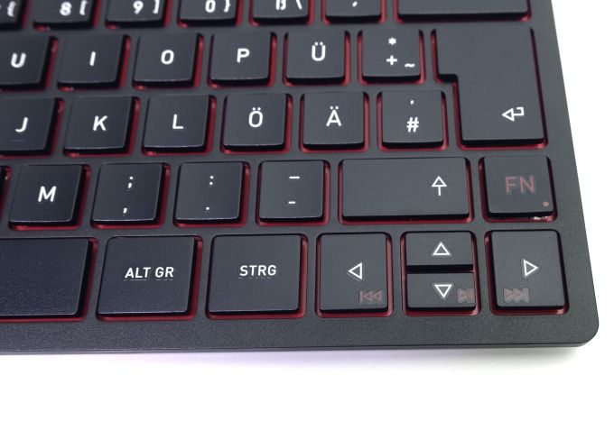 Die Steuerung der Medienwiedergabe ermöglichen hingegen Zweitbelegungen der Pfeiltasten. Diese Cursortasten hat Cherry etwas zusammengedrängt, die Tasten für Pfeil hoch und Pfeil runter haben nur halbe Höhe. Etwas gewöhnungsbedürftig ist die Platzierung der FN-Taste unterhalb der Enter-Taste. Mit der Cherry KEYS-Software bietet Cherry ein kleines Programm an, mit dem bei Bedarf einige Tastenbelegungen angepasst werden können.