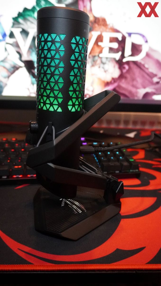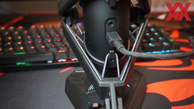 Neben dem integrierten Hochpassfilter für Geräusche unter 80 Hz wirbt ROG auch mit dem eingebauten Pop-Schutz. Dieser besteht aus Schaumstoff- und Netzschichten, die plosive Laute bei Benutzung aus der Nähe herausfiltern. Hinzu kommt der Schutz vor übertragenen Vibrationen durch die Aufhängung im Metallfuß. Das Gerät hängt frei in der Halterung und ist durch elastische Gummibänder befestigt. Durch ein Kippen des Fußes kann die Position leicht angepasst werden. Neben der Abschirmung sorgt der Fuß auch für einen stabilen Stand auf dem Schreibtisch. Er wirkt hochwertig und gut verarbeitet.