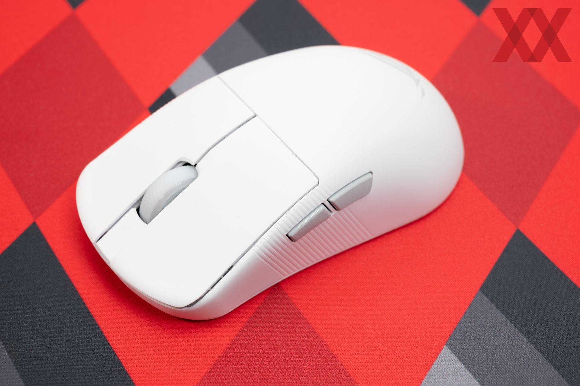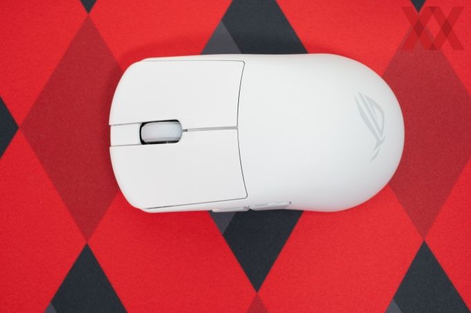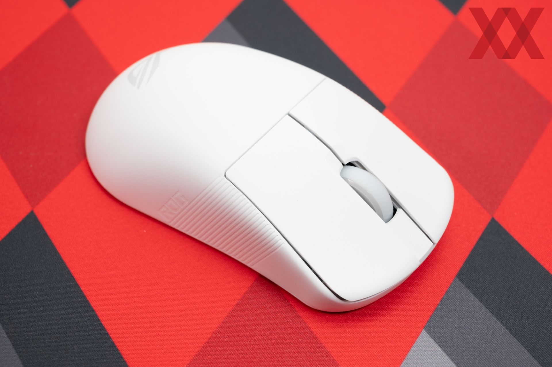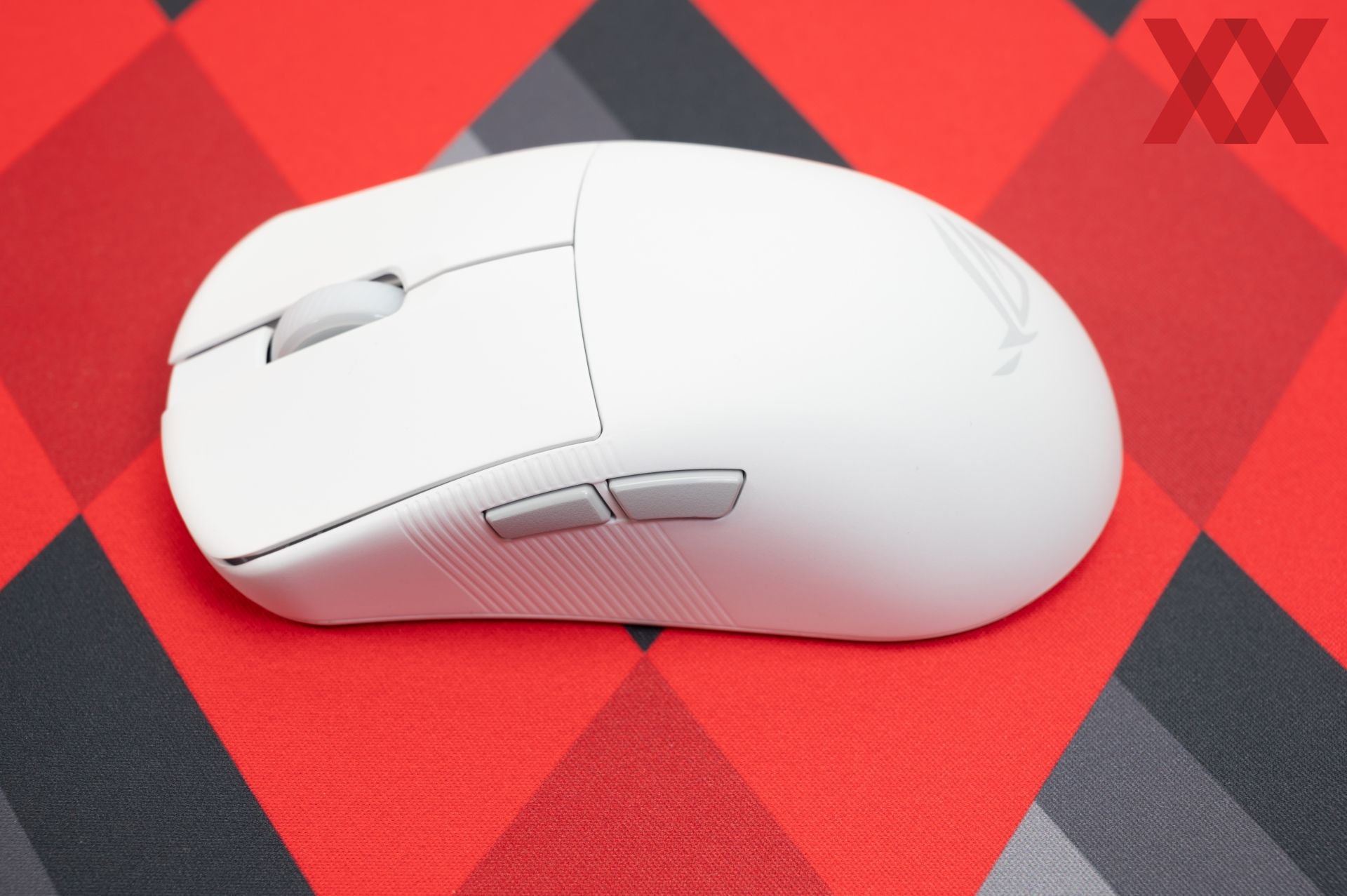 Wie eigentlich bei fast jeder Maus am Markt, ist das Gehäuse aus Kunststoff. Das Case ist in Weiß gehalten, es gibt aber auch eine schwarze Version. Lediglich die Seitentasten, das Logo von ROG und das Mausrad bieten einen leichten farblichen Kontrast mit einem blassen Grau. Das ROG-Logo ist jedoch nur auf das Gehäuse gedruckt worden und ist keine RGB-Zone. Lediglich das Mausrad selbst ist beleuchtet. Durch ihre geringeren Abmessungen ist die ASUS ROG Harpe Ace Mini eine Maus, die sich auch für kleinere Hände eignet.
