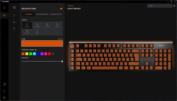 Die Steuerung und individuelle Konfiguration der Tastatur erfolgt über die hauseigene Software be quiet! IO Center. Diese erlaubt die freie Belegung aller Tasten, das Erstellen komplexer Makros, das Anlegen und Wechseln von Benutzerprofilen sowie eine umfassende Anpassung der ARGB-Beleuchtung. Dabei lassen sich Farbverläufe, Animationen und statische Beleuchtungen genauso umsetzen wie zonenspezifische Farbverteilungen.