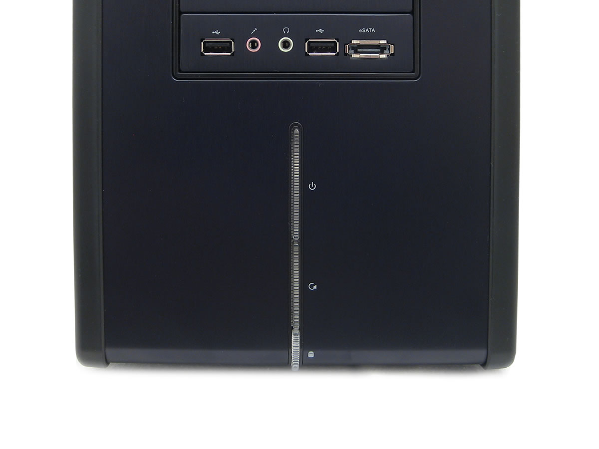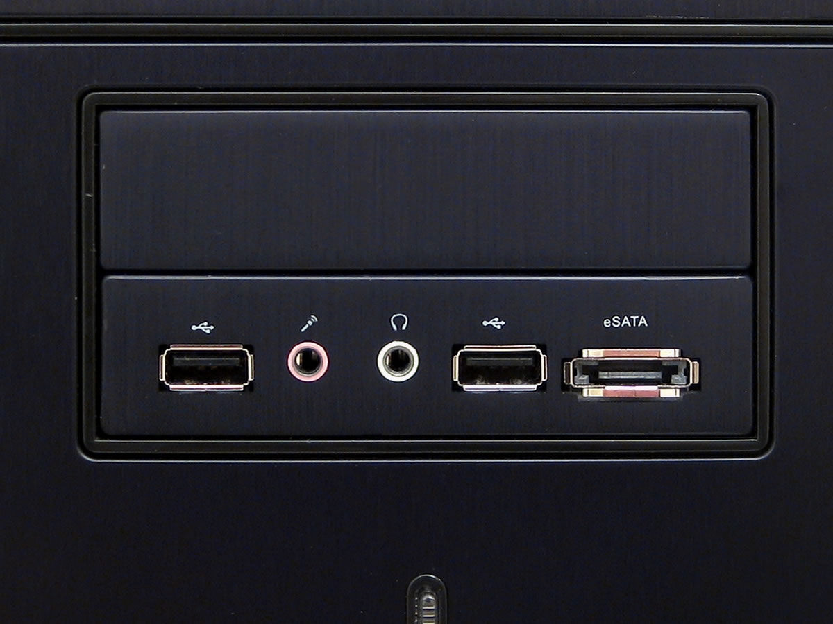Anders als bei vielen anderen Gehäusen, befindet sich das obligatorische I/O-Panel in einem herkömmlichen 3,5-Zoll-Laufwerksschacht. Neben USB-Anschlüssen und Audio-In/Out-Ports wartet das Frontpanel mit einem eSATA-Anschluss auf. Die Anschlüsse sind deutlich beschriftet und gut erreichbar.