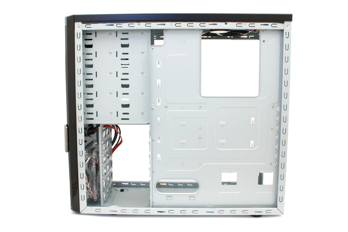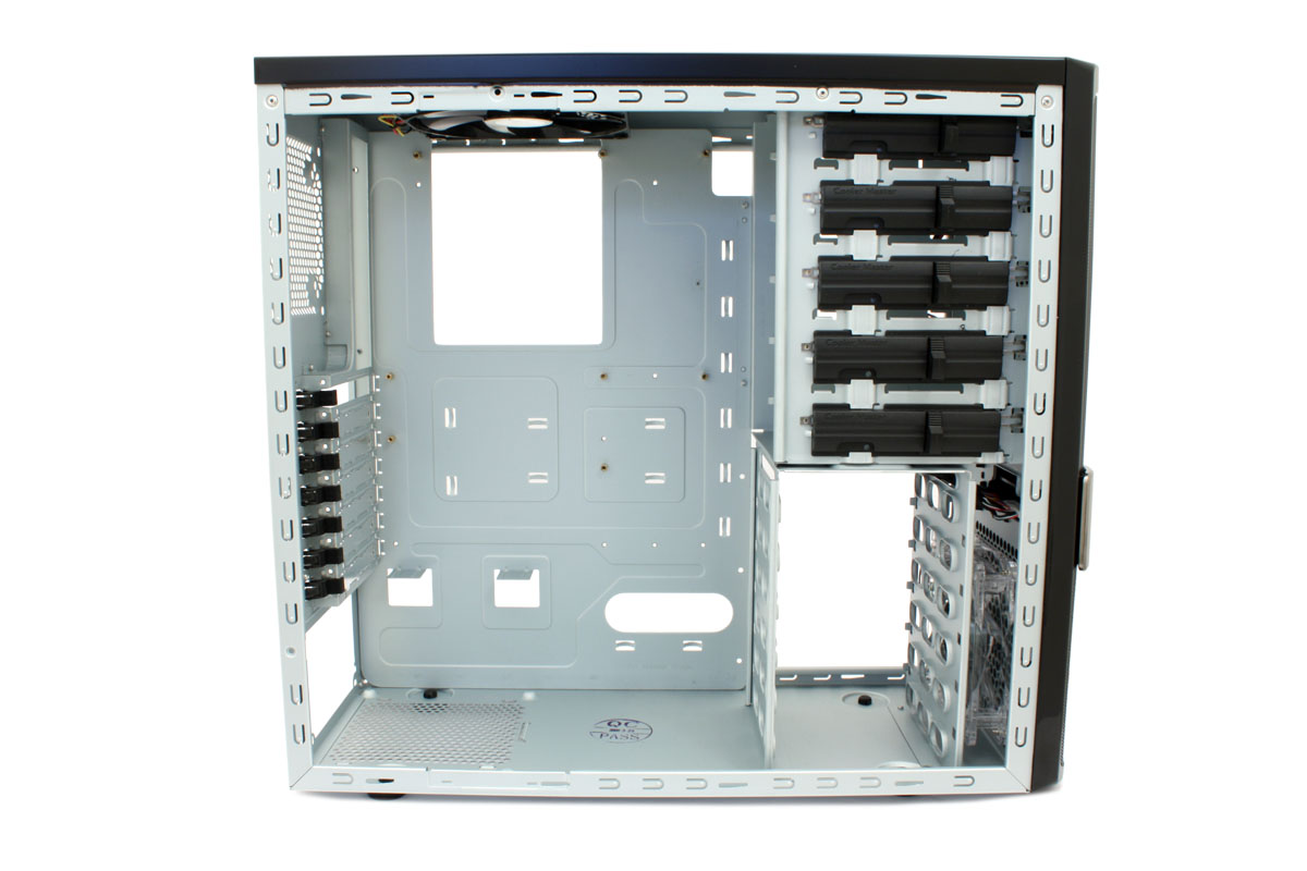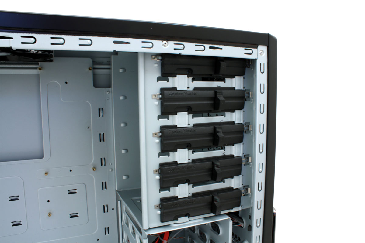 Aufgeschraubt findet man einen bekannten Innenraum vor. Cooler Master nutzt das gleiche Grundgerüst wie beim CM Storm SCOUT, welches wir in der aktuellen Hardwareluxx [printed] (Heft 05/2009) unter die Lupe genommen haben. Lediglich die fehlende Lackierung im Innenraum unterscheidet unseren Testkandidaten vom 25 Euro kostspieligeren Gaming-Gehäuse. Alles in allem kann das Gehäuse bis zu zehn Laufwerke beherbergen, wovon fünf in 5,25-Zoll- und ebenso viele in 3,5-Zoll-Laufwerkschächten platziert werden.