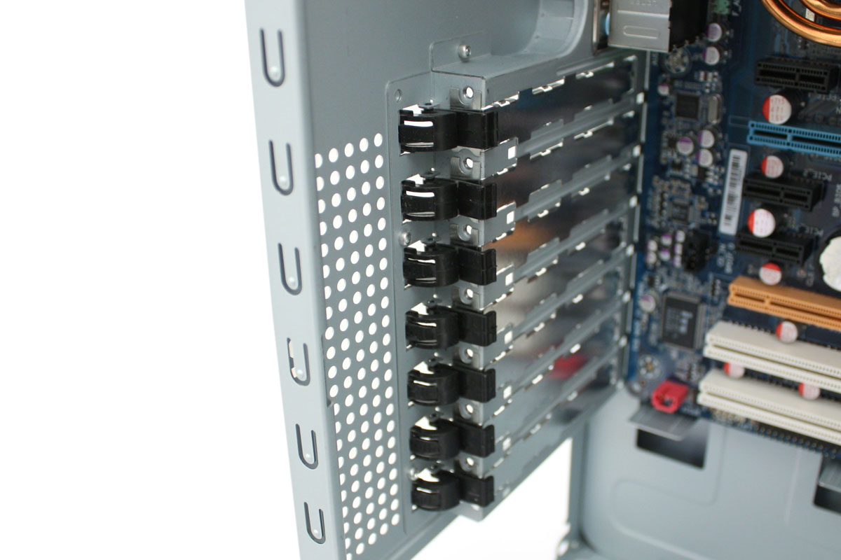 Sowohl die Laufwerke als auch die Erweiterungskarten werden mit einem werkzeuglosen Montagesystem befestigt. Die 5,25-Laufwerke werden einfach in den Schacht geschoben und durch einen Schieber mit Lock-Funktion gesichert. So können die Laufwerke binnen Sekunden montiert werden. Die Festplatten werden mithilfe von Laufwerksschienen in den um 90° gedrehten Käfig eingebaut. Die Laufwerksschienen werden lediglich an die Festplatte geklemmt und anschließend in den Käfig geschoben.