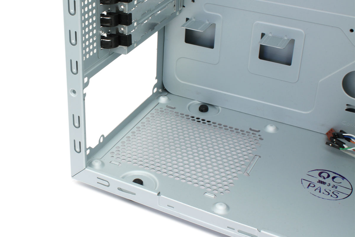 Das Mainboard-Tray kommt mit zahlreichen Features daher. Neben einem großflächigen Ausschnitt, der die unkomplizierte Montage eines mit Backplate verschraubten CPU-Kühlers auch im eingebauten Zustand erlaubt, stehen dem Anwender zahlreiche Öffnungen für ein einfacheres Kabelmanagement zur Verfügung. Wie für diese Preisklasse üblich, ist die Mainboard-Halterung fest vernietet und nicht herausnehmbar.