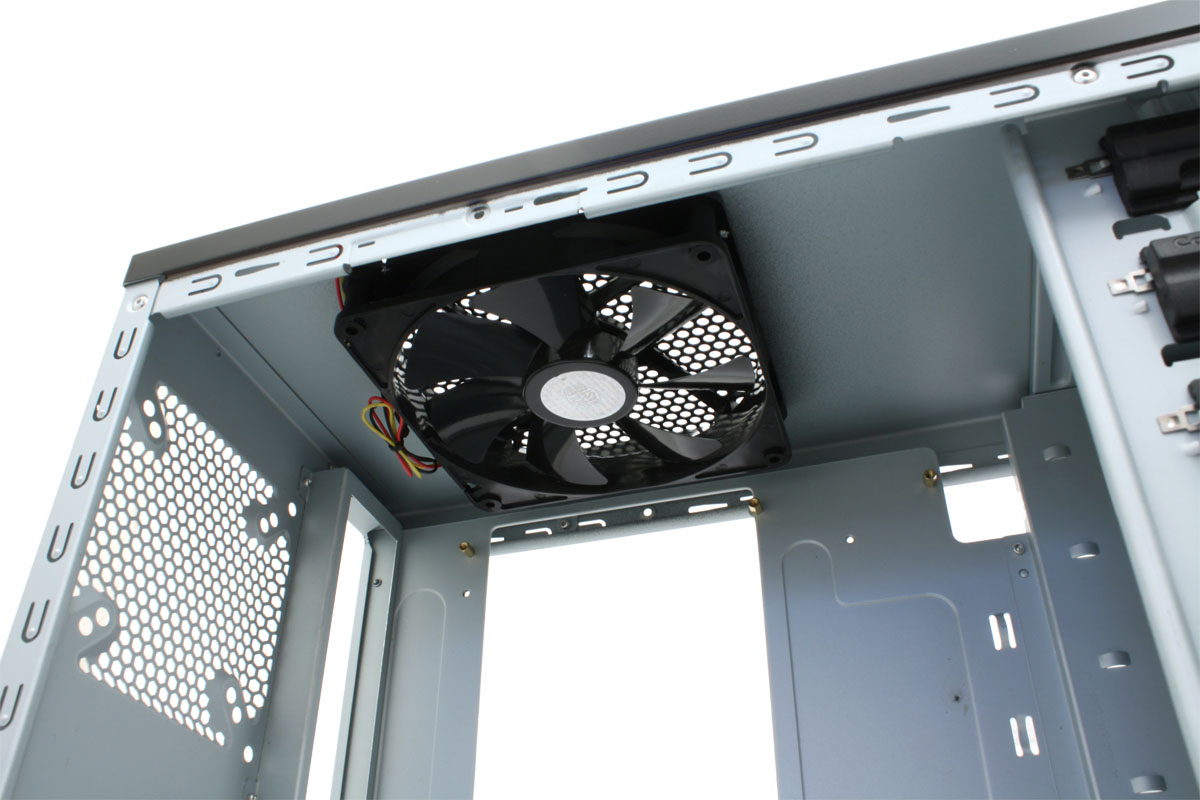 Zur Be- und Entlüftung dienen ein 120-mm-Lüfter in der Front sowie ein 140-mm-Pedant im Deckel. Optional kann die Gehäuserückseite mit einem 120-mm-Ventilator sowie die linke Seitenwand mit zwei weiteren Lüftern bestückt werden. Der beiliegende 140-mm-Lüfter im Deckel dreht mit 1200 U/min und ist unbeleuchtet. Der 120-mm-Lüfter in der Front sorgt dank seiner Position vor dem 3,5-Zoll-Käfig für niedrige Festplattentemperaturen.