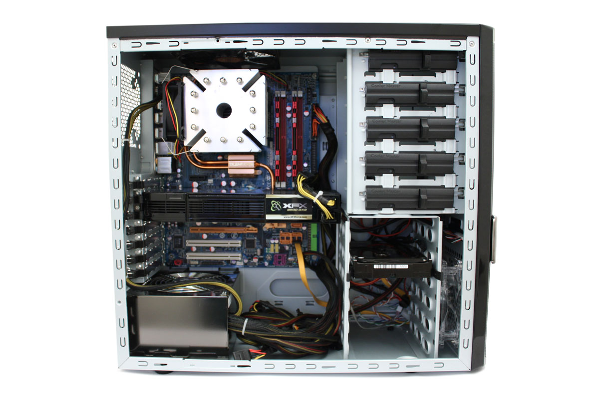 Die Temperaturen im Gehäuse sind zwar noch im grünen Bereich, jedoch ist insbesondere das Mainboard auffallend warm geworden. Grund dafür ist der fehlende Lüfter im Heck, wodurch nur ein minimaler Luftstrom über die Platine weht. Im Gegensatz zum Mainboard waren die Temperaturen der Festplatte sehr gut. Dadurch, dass der Festplattenkäfig direkt vor einem 120-mm-Lüfter montiert werden ist, kommt die Western-Digital-Raptor-X-Festplatte mit 10.000 Umdrehungen pro Minute auch unter Last nicht ins Schwitzen. Auch die XFX GeForce 9800 GX2 ist mit 83 °C nicht sonderlich heiß.