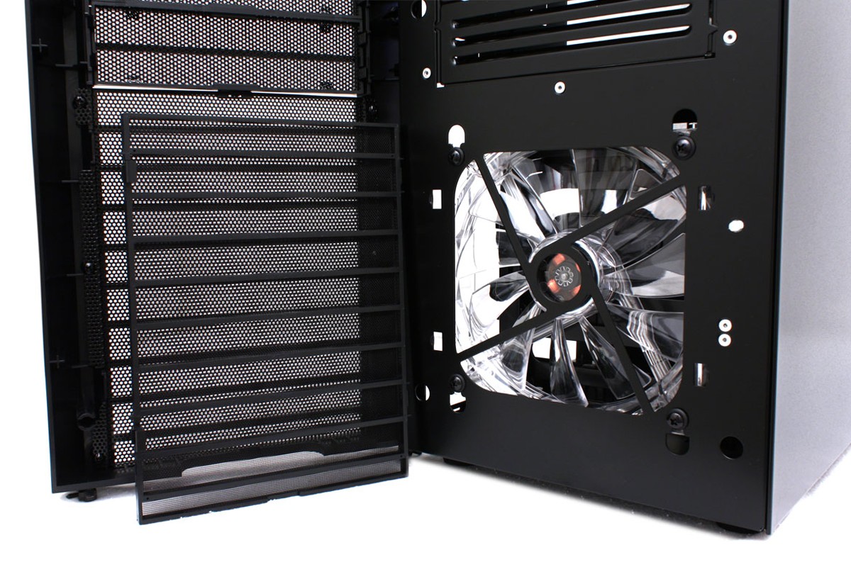 Wie zuvor bereits erwähnt, kann neben dem Deckel auch die Front abgenommen werden. Hinter der Vorderseite befindet sich ein 120-mm-Lüfter, der mit 1000 U/min rotiert. Ein abnehmbarer Staubfilter schützt den Lüfter und die dahinter liegenden Komponenten zuverlässig vor Verunreinigung.