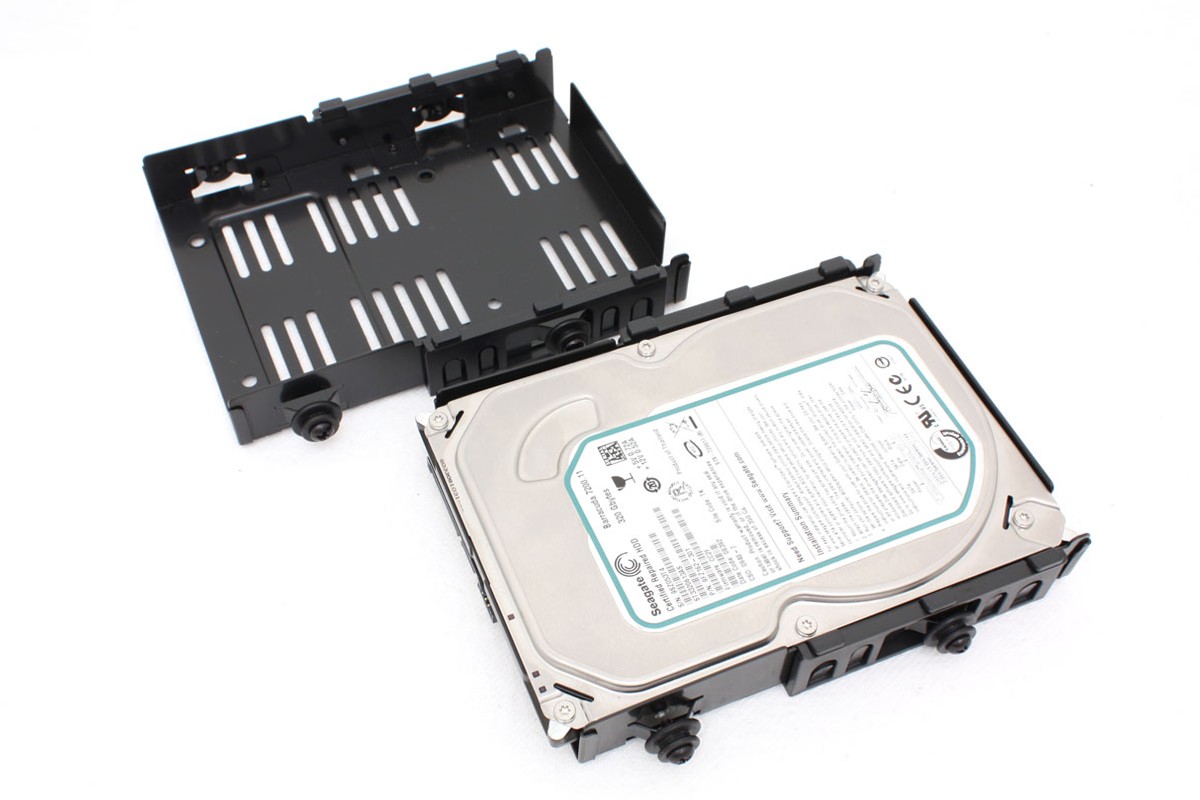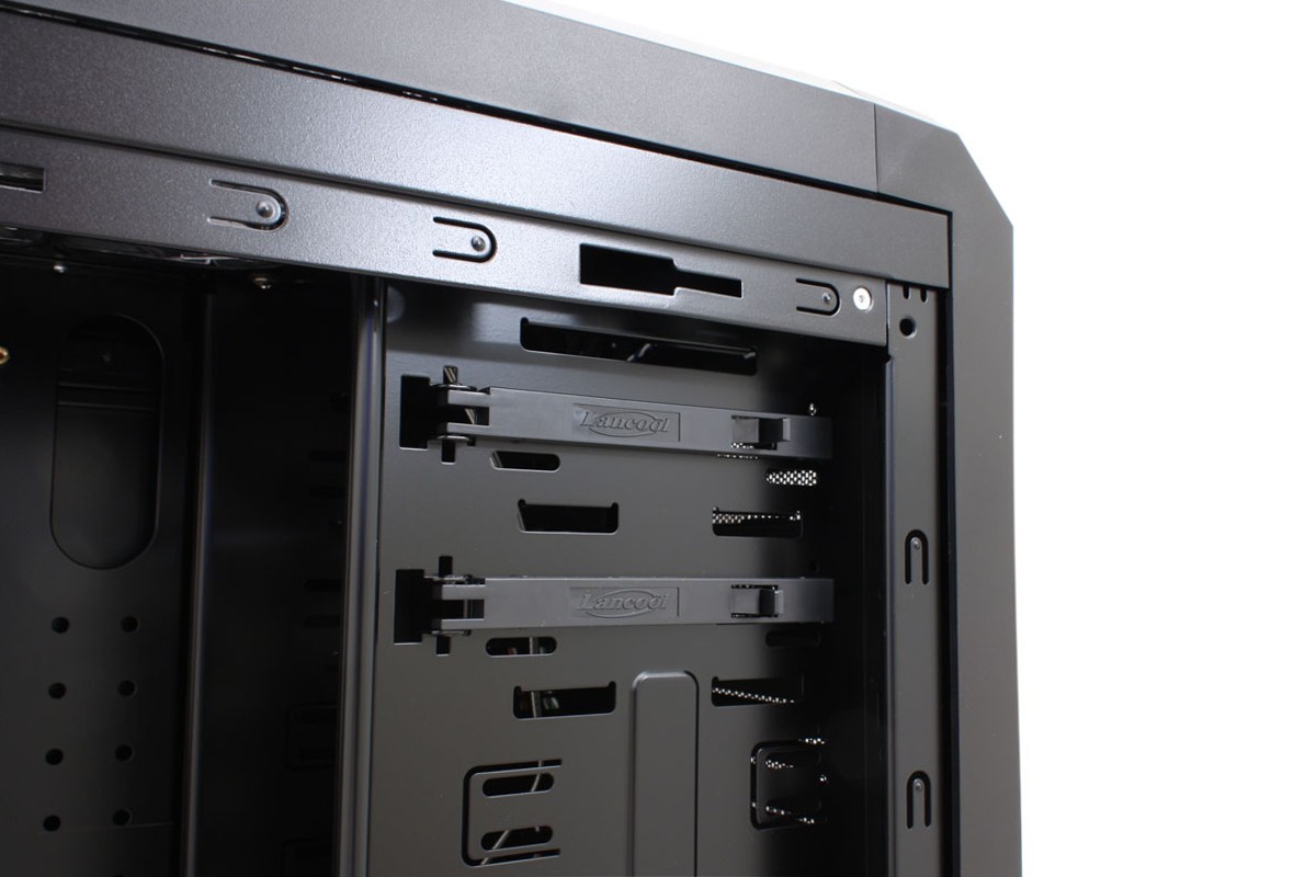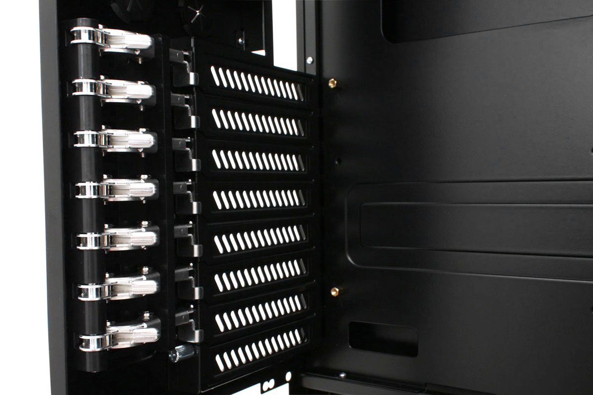 Die Festplatten-Schubladen können sowohl 3,5-Zoll- als auch 2,5-Zoll-Laufwerke wie beispielsweise aktuelle SSDs aufnehmen. Die Schubladen werden in einem um 90 Grad gedrehten Käfig untergebracht und sind zur Geräuschminimierung entkoppelt. Eine vertikale Schiene, welche mit einer Rändelschraube festgeschraubt wird, sichert die Schubladen zusätzlich ab.