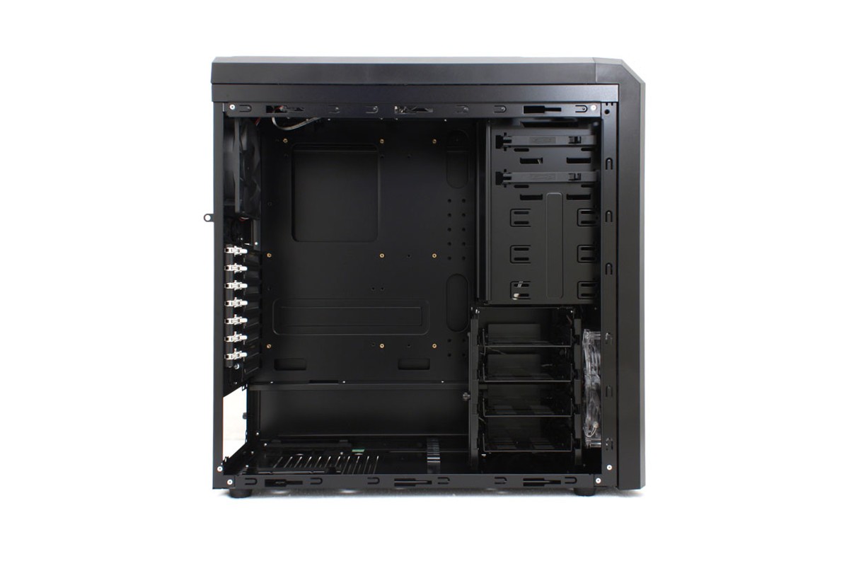 Aufgeschraubt zeigt sich das Lancool PC-K62 von seiner schönsten Seite. Die Ausstattung setzt in puncto Umfang und Funktionalität neue Maßstäbe in diesem Preissegment und überzeugt auf ganzer Linie. Der gesamte Innenraum ist schwarz lackiert und bietet ausreichend Platz für aktuelle High-End-Komponenten. Das Mainboard-Tray kann sowohl herkömmliche ATX- als auch mATX-Platinen aufnehmen. Beim Belüftungskonzept geht Lancool mit dem aktuellen Trend und setzt auf insgesamt vier Lüfter. Der vordere Lüfter zieht die Frischluft ins Gehäuse und der rückseitige Lüfter sowie die Varianten im Deckel sorgen für den Abtransport der erwärmten Luft.