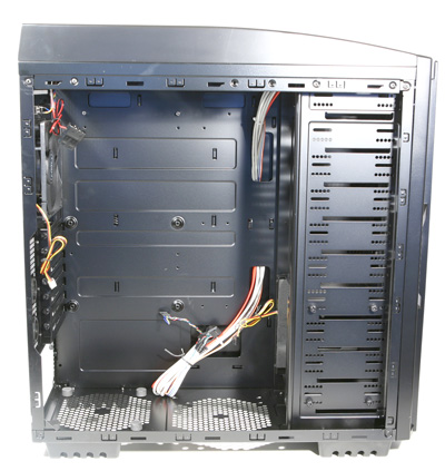 Bereits ein Blick auf die Rückseite ließ es vermuten, NOX hat seinem Coolbay HX einen gänzlich schwarzen Innenraum spendiert und zollt somit dem aktuellen Trend Tribut. Die Zeiten, in denen ein schwarzes Innenleben etwas Besonderes war und einen Hauch von Individualismus verströmte sind nun also endgültig vorbei. Den optischen Effekt soll dies aber keinesfalls schmälern, denn ein schwarzes Innenleben setzt die verbaute Hardware sehr gut in Szene. Der Innenraum bietet mit jeweils 290 mm für Netzteile und Steckkarten mehr als genügend Platz, um auch Maxi-Modelle mühelos verstauen zu können.