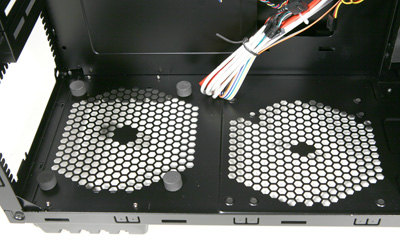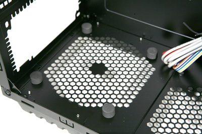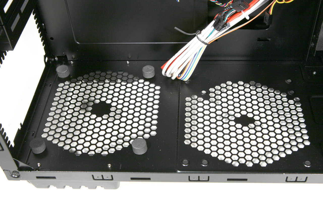 Am Boden des Coolbay HX hat der Hersteller zahlreiche Öffnungen für eine gute Belüftung gelassen. Während die hinteren Öffnungen für ein Netzteil mit 120-mm-Lüfter vorgesehen sind, kann im mittleren Segment ein zusätzlicher 120er integriert werden. Dank der ohnehin großzügigen Belüftungsmöglichkeiten wird ein weiterer Zusatzrotor aber kaum vonnöten sein.