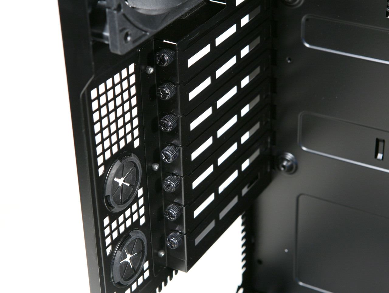 Anders als viele Hersteller verbaut NOX kein Haltesystem zur Fixierung der Steckkarten, sondern setzt auf schwarze Rändelschrauben. Da bislang aber einzig Lian Lis Haltesystem auch bei schweren Karten auf der ganzen Linie überzeugen konnte, ist NOX‘ Schritt durchaus positiv einzustufen. Rändelschrauben lassen sich einfach handhaben und garantieren zudem einen äußerst festen Halt. Gut zu sehen sind hier noch einmal die geschlitzten Slotblenden.