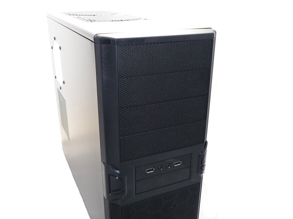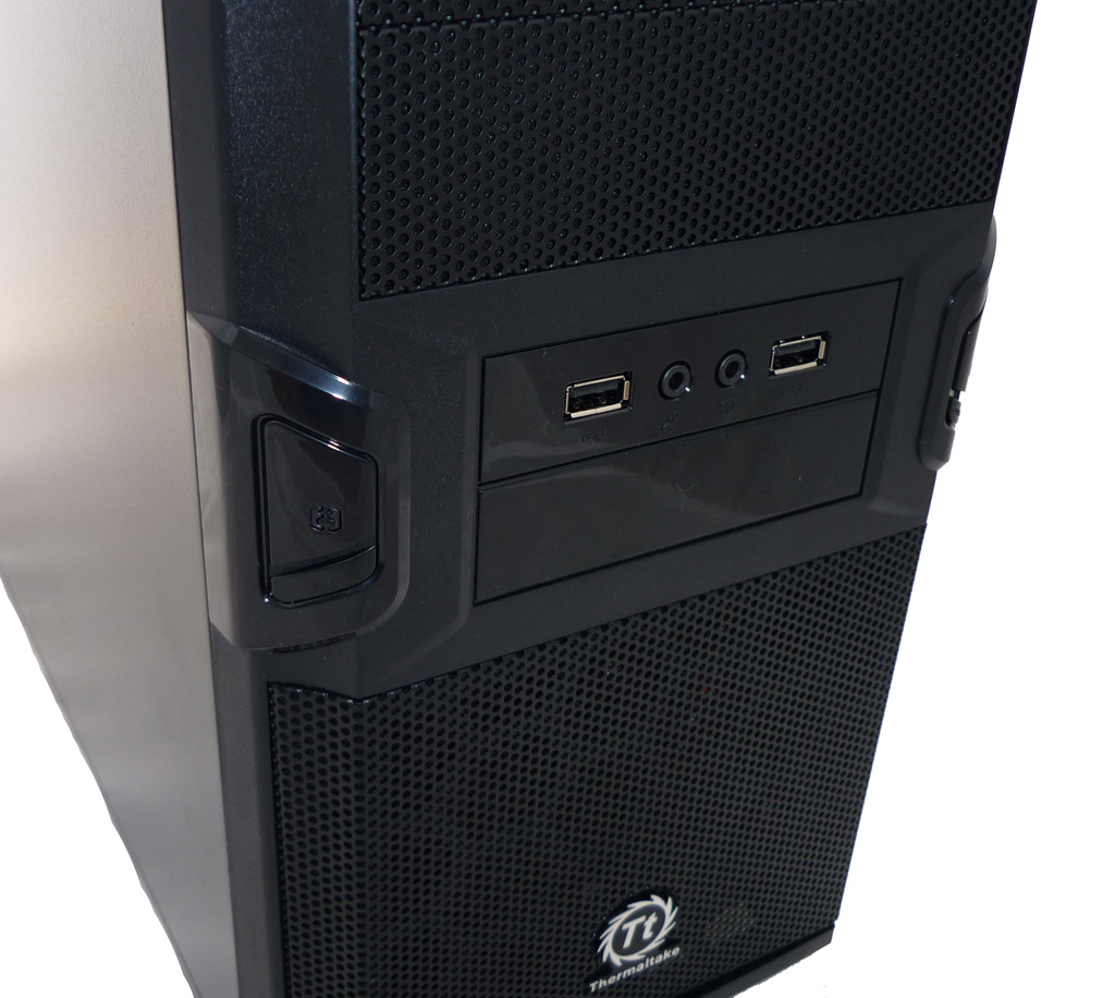 Als Anschlussmöglichkeiten setzt das V3 Black Edition auf die in dieser Preisklasse üblichen zwei USB-2.0-Ports sowie Audio-IN/OUT-Buchsen. eSATA- sowie Firewire-Anschlüsse sucht man hier vergebens. Zur optischen Abrundung verbaut Thermaltake an den Seiten einen großen Power-On-Knopf und darunter den zu klein geratenen Reset-Schalter. Auf der linken Seite wird lediglich die Festplattenaktivität mit einer roten LED visualisiert.