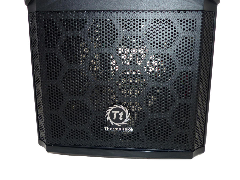 Der untere Bereich wird im Mesh-Design in Waben-Optik dominiert. Hinter der abnehmbaren Front kann zusätzlich ein 120-mm-Lüfter angebracht werden. Dieser wird mit einem integrierten Staubfilter abgeschlossen und verhindert das Eindringen von Staub. Das typische Thermaltake-Logo wurde ebenfalls angebracht.