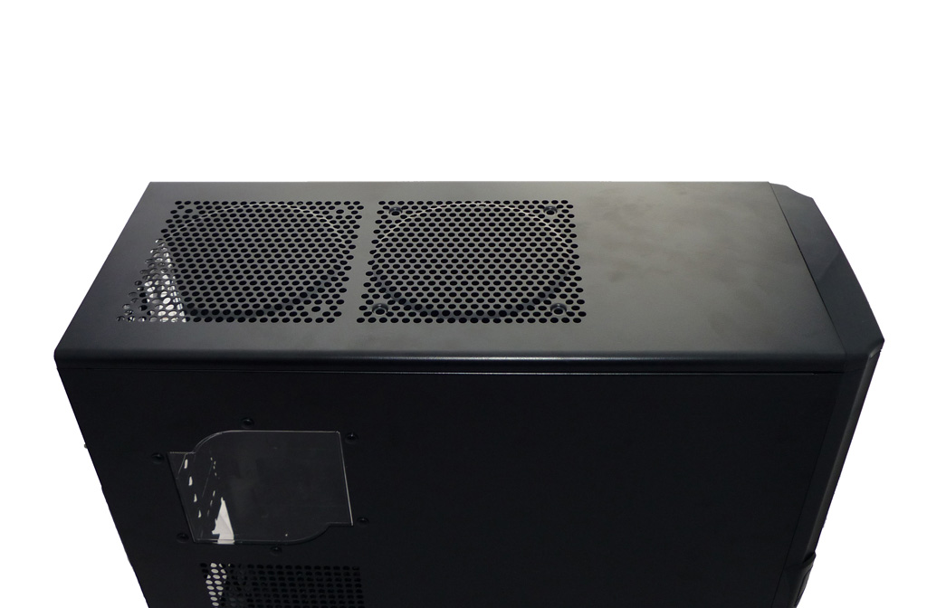 Passend zur Auslegung auf Wasserkühlungen sind im Gehäusedeckel zwei Öffnungen für einen Dual-Radiator vorgesehen. Diese können jeweils einen 120-mm-Lüfter aufnehmen oder ohne Radiator zur zusätzlichen Kühlung des Gehäuses verhelfen- leider wurde hier nicht an Staubfilter gedacht.