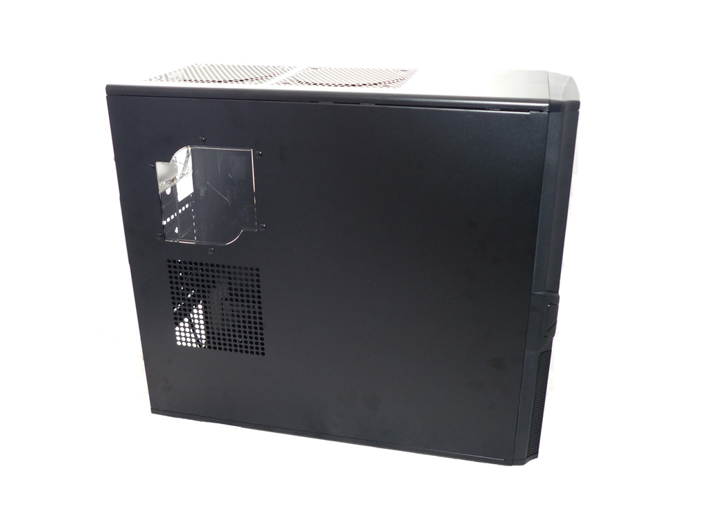 Beim Blick auf die Seite schlägt das Modding-Herz höher. Auch hier dominiert die schwarze Farbgebung. Erfreulicherweise wurde hier an ein kleines Fenster in der Seitenwand gedacht, dahinter werden Teile des Mainboards sowie der bereits vorinstallierte und beleuchtete 120-mm-Lüfter sichtbar. Direkt darunter befindet sich eine 110 mm x 110 mm große Gitteröffnung im Waben-Design. Hier wird die Möglichkeit geboten, einen weiteren Lüfter zu befestigen. Die maximale Größe des zu installierenden Lüfters beträgt 140 mm.