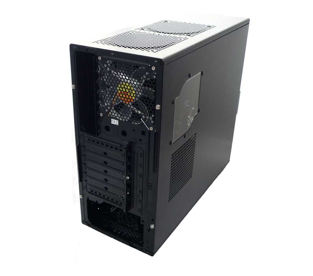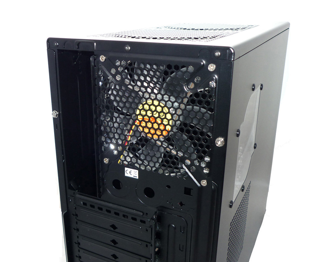 Die Rückseite wird von einem matt-schwarzen Farbton dominiert. Die Anordnung der rückwärtigen Komponenten entspricht dem modernen ATX-Standard. Erfreulicherweise wurde hier das Netzteil auf den Boden des Gehäuses versetzt, was Inkompatibilitäten mit großen CPU-Kühlern ausschließt. Direkt darüber befinden sich die Erweiterungsblenden sowie der vorinstallierte 120-mm-Lüfter, zwei Öffnungen für Wasserkühlungs-Schläuche sowie die ATX-Blendenöffnung.