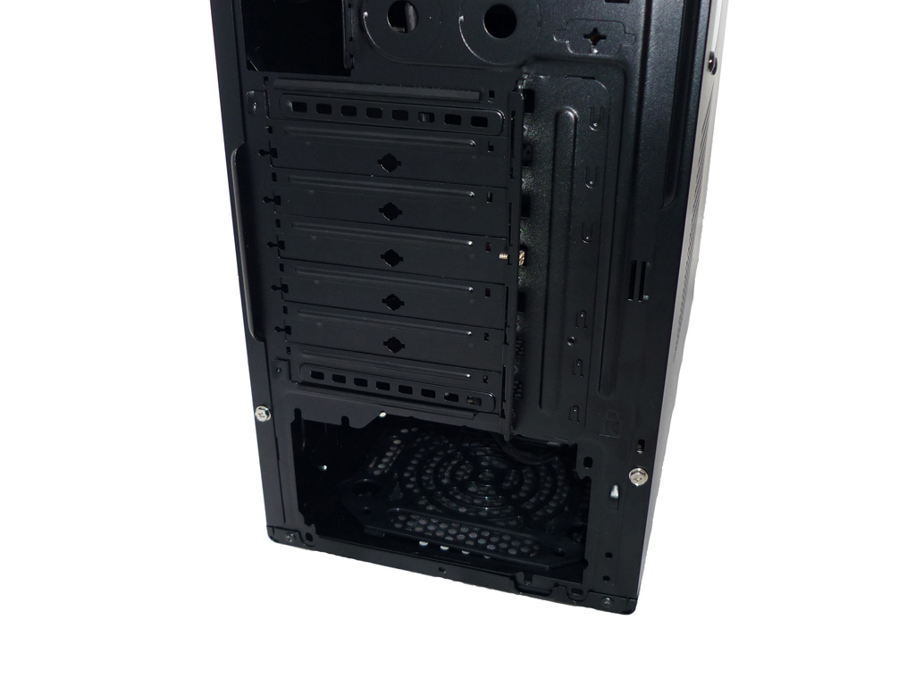 Im unteren Bereich sitzt das Netzteil und wird mittels Schrauben befestigt. Hier kann ein ATX-konformes Fabrikat verbaut werden. Direkt darüber können bis zu sieben Erweiterungskarten verbaut werden. Diese werden im Klemmprinzip an ihrem Platz gehalten. Hier wurde jedoch der Rotstift angesetzt und keine schraubenlose Montage, wie im kürzlich von uns getesteten Xigmatek Asgard Pure Black Edition Gehäuse, angeboten. Lediglich eine Klemmung mithilfe von einer zentralen Schraube sichert die Erweiterungskarten vor dem Absturz.