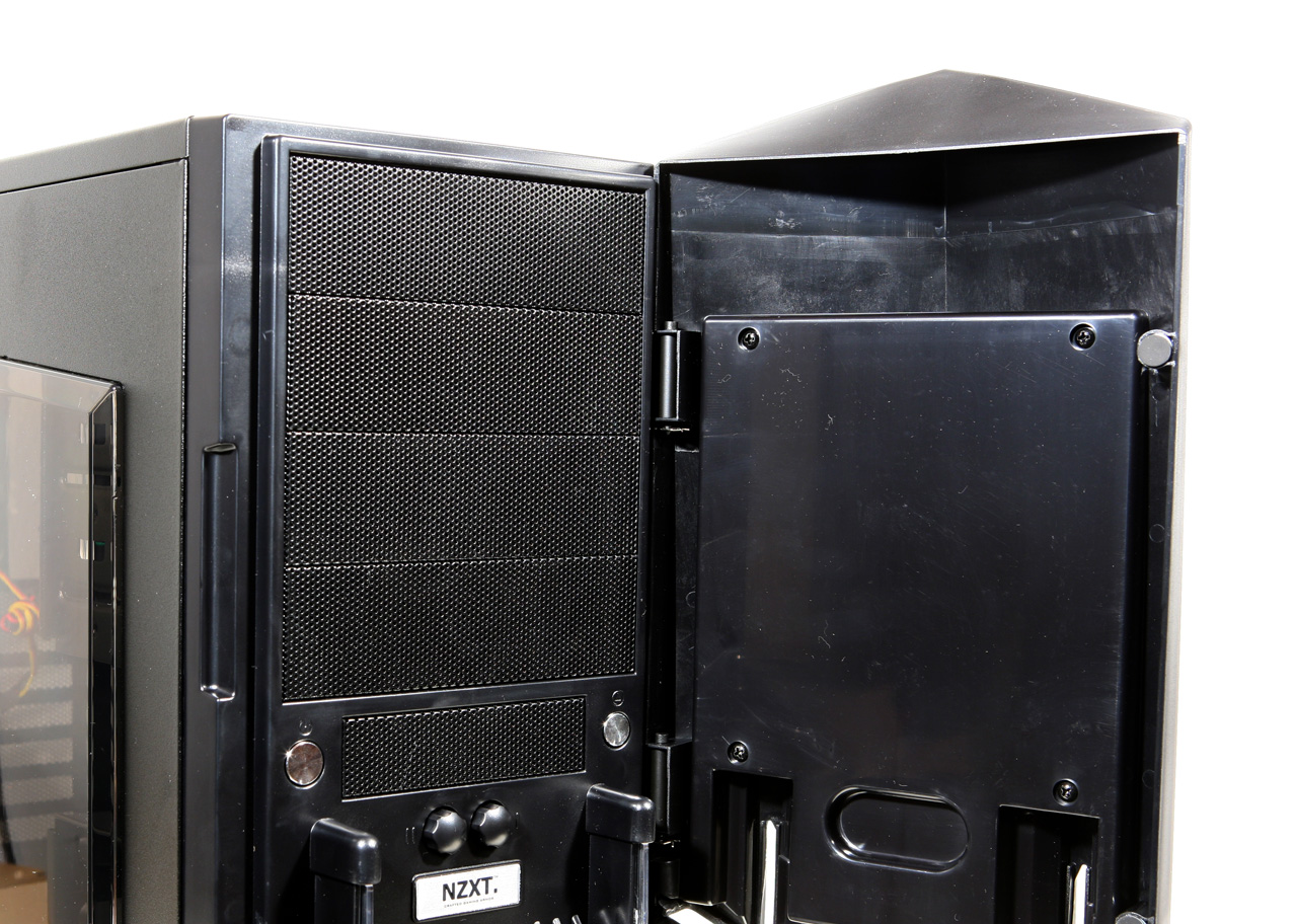 Hinter der Frontklappe befinden sich vier 5,25-Zoll-Schächte sowie eine Aufnahme für ein 3,5-Zoll-Laufwerk. NZXT setzt bei allen Blenden auf die aktuell sehr beliebte Mesh-Optik. Diese hat in der Regel zudem den Vorteil, dass sie dem Luftaustausch zwischen dem Gehäuse-Inneren und der Umwelt wesentlich zugutekommt. Da NZXT beim LeXa S jedoch eine durchgehend geschlossene Frontklappe verbaut, können die Blenden als gefälliges optisches Gimmick eingestuft werden. Ordnung muss jedoch sein: Alle Blenden wurden mit Staubfiltern ausgestattet. Steht die Tür also auch einmal eine längere Zeit offen, hat der Anwender nicht mit einem Staubproblem zu kämpfen.