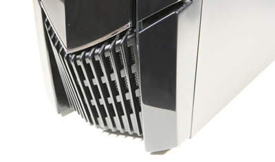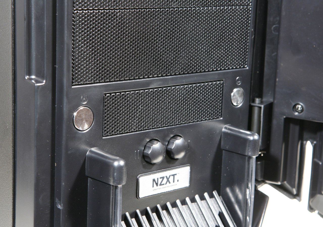 Zudem befinden sich hinter der Front-Klappe sowohl der Hauptschalter als auch der Reset-Taster sowie zwei Drehregler für eine praktische, integrierte 2-Kanal-Lüftersteuerung. Die Drehregler liegen gut in der Hand und besitzen einen angenehmen Drehwiderstand. Weniger angenehm ist es hingegen, dass das Power-Taster hinter der Klappe versteckt wurde. So muss diese bei jedem Systemstart geöffnet werden. Ein weiteres Manko besteht darin, dass die Tür nur in eine Richtung geöffnet werden kann – Anwender, deren PC auf der linken Seite steht, haben also das Nachsehen.