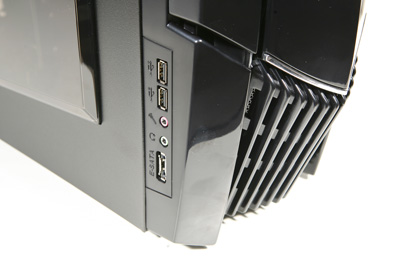 Das Front-Panel – wenn man es beim LeXa S denn so nennen mag – befindet sich im unteren Teil der linken Gehäuseseite. Gerade dann, wenn der PC auf dem Boden steht, ist es daher also nur schwer zu erreichen – hier wäre eine Positionierung im Deckel wünschenswert gewesen. Es gibt jedoch auch gutes über das Panel zu berichten: mit zwei USB-Anschlüssen, zwei Klinke-Buchsen und einem eSATA-Port fällt es recht umfangreich für die 70-Euro-Klasse aus.
