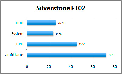 Wen sollte es überraschen: auch nach einem langen Volllastbetrieb zeigt sich unser Testsystem als kühl und unbeeindruckt. In ungeregeltem Zustand sind die verbauten Lüfter jedoch rechte Rabauken, die lautstark auf sich aufmerksam machen. Werden die Ventilatoren über die integrierte Lüftersteuerung jedoch gedrosselt ändert sich das Bild. Auf kleinster Stufe sind Lüfter zwar weiterhin wahrnehmbar - was beispielsweise auch an den, durch das installierte Lüftergitter verursachten Luftverwirbelungen liegt, werden in den meisten PC-Konfigurationen aber im Grundrauschen untergehen. Der Lüfter der meisten Grafikkarten ist beispielsweise auch im 2D-Betrieb merklich lauter.