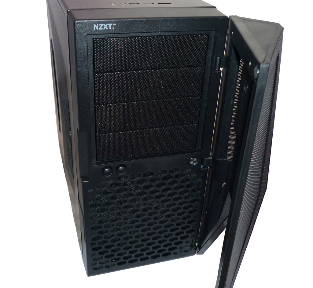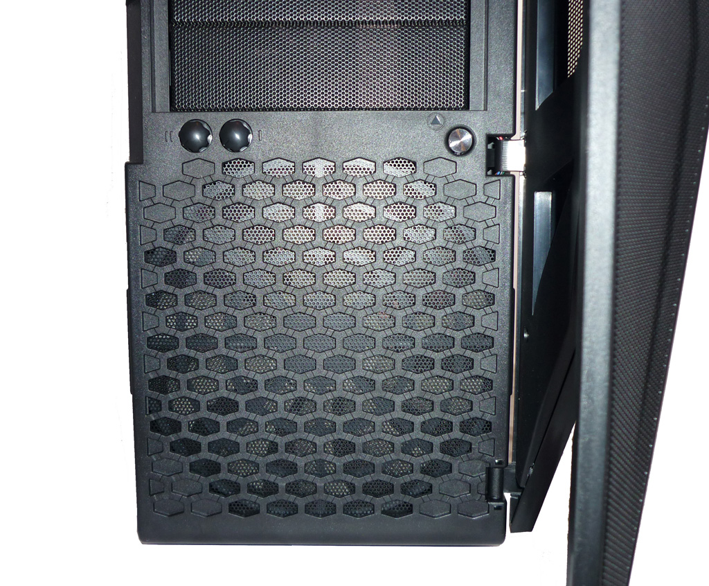 Die abnehmbare Front des Hades wird von einer nur einseitig zu öffnenden Tür verdeckt. Diese besteht bis auf Ausnahme der Laufwerksblenden komplett aus schwarzem Kunststoff. In der linken oberen Ecke findet sich das Hersteller-Logo wieder. Das Hades bietet maximal vier externen 5,25-Zoll-Laufwerken Platz. Nicht genutzte Einschübe werden mit Blenden im Mesh-Design verschlossen. Sehr positiv anzumerken ist die Tatsache, dass hinter diesen jeweils herausnehmbare Staubfilter sitzen.