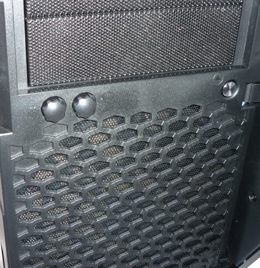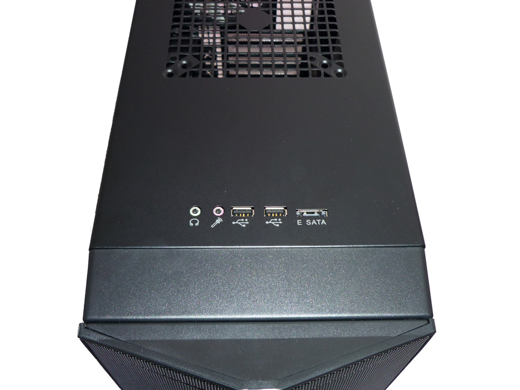 Die externen Anschlussmöglichkeiten sind für einen Midi-Tower der preislichen Mittelklasse entsprechend zahlreich vorhanden. Verbindungsmöglichkeiten für Audio-IN/-Out, zwei USB-2.0-Ports sowie ein eSATA-Anschluss sind vollkommen ausreichend. Lediglich Firewire vermisst man hier. Etwas ungünstig ist jedoch eine fehlende Schutzkappe für jene Anschlüsse, hier kann sich ungehindert Staub und sonstiger Schmutz festsetzen.
