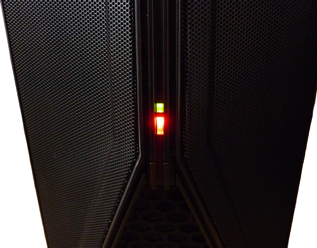 Eine weitere Besonderheit des Hades ist die verbaute Frontblende im Tarnkappen-Look. In der zweigeteilten Mitte befindet sich am untersten Ende, gut versteckt, die Power-On-Taste. Diese wurde im Design des Mittelkanals gehalten und ist auf den ersten Blick nicht zu erkennen. Direkt darüber sind die beiden Leuchten für den Betrieb des Computers sowie die Anzeige für die Festplatten- Aktivität vorhanden.