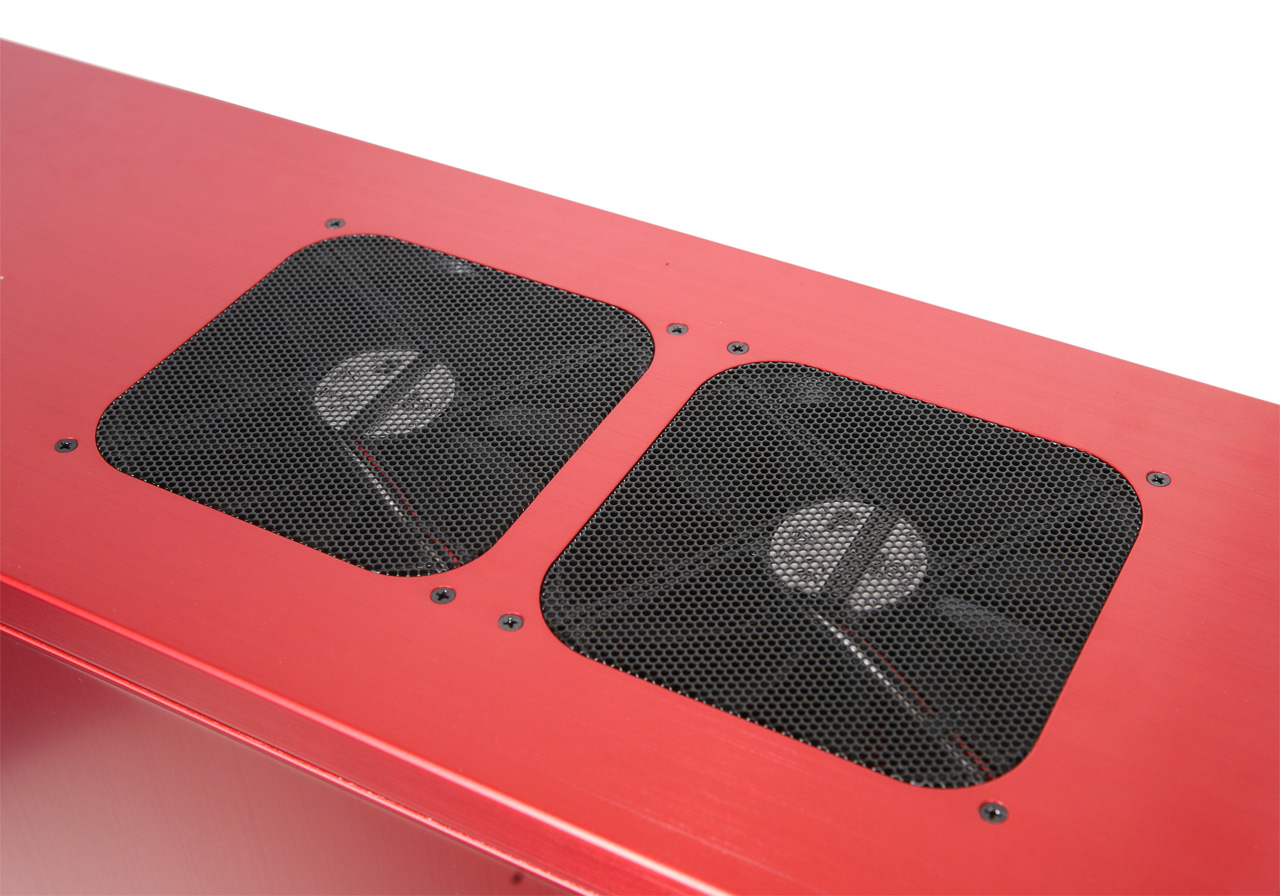 Dass Lian Li auf einen hohen Airflow Wert legt, zeigt der Deckel. Verzichtete man in der Vergangenheit weitestgehend auf zusätzliche Ventilatoren im Deckel, kann das PC-A77F hier zwei 140-mm-Rotoren vorweisen. Während das Mesh-Gitter in der schwarzen Version angenehm dezent ist, wirkt es bei unserem in Rot gehaltenen Test-Kandidaten wie ein störender Fremdkörper.