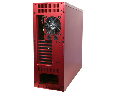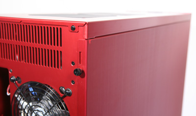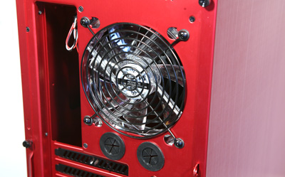 Rückwärtig kommt ein 120-mm-Lüfter zum Einsatz, der bei unserer Version Rot beleuchtet ist. Silent-Fans können sich hier gleich doppelt freuen: Zum einen lässt sich das Lüftergitter entfernen, sodass geräuschvollen Luftverwirbelungen der Kampf angesagt werden kann. Zum anderen wird der Lüfter entkoppelt verbaut, was gerade bei leichten Aluminium-Gehäusen von Vorteil ist. Damit auch Fans einer Wasserkühlung nicht zu kurz kommen, hat Lian Li Auslässe für eine Wasserkühlung integriert.