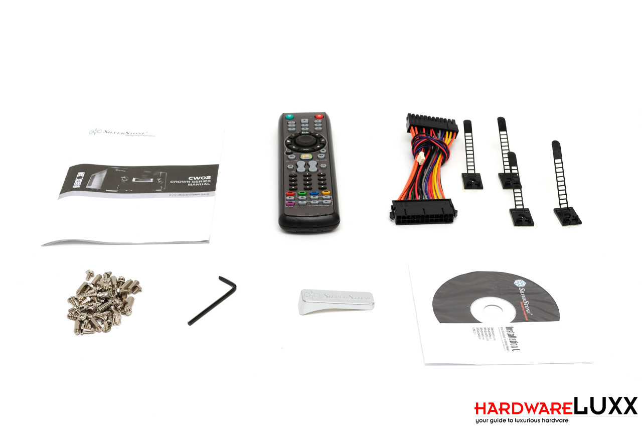 Schauen wir uns nun den Lieferumfang des CW02 etwas näher an. Mit dabei sind eine gedruckte Gebrauchsanweisung, eine Fernbedienung, ein 24 poliger ATX-Adapter für das Display, wiederverwendbare Kabelbinder, ein Sortiment an Schrauben, ein Inbusschlüssel, ein aufklebbares SilverStone-Logo und eine Treiber-CD samt iMON-Software. Batterien gehören nicht dazu.