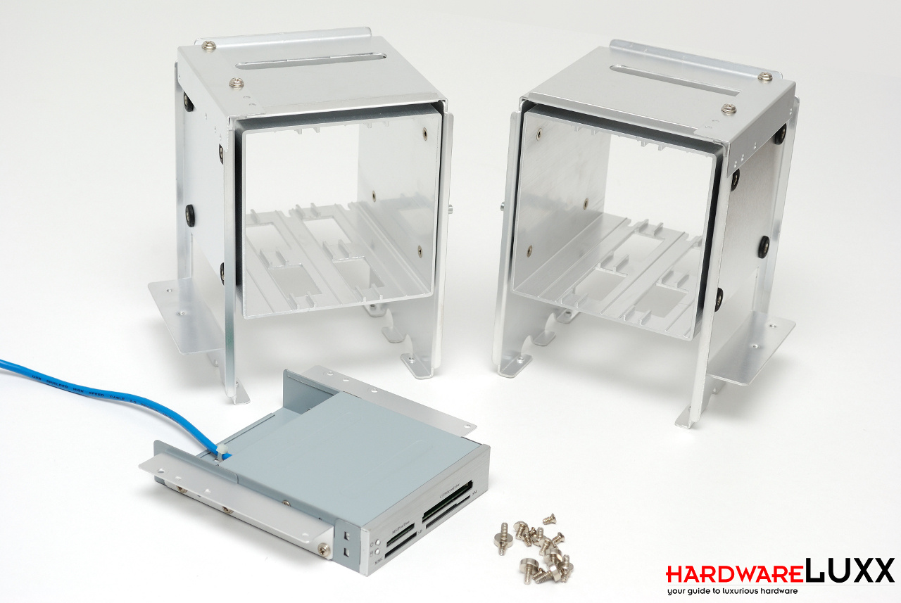Im Wesentlichen bestehen die Laufwerkskäfige aus zwei Rahmen - innerer und äußerer - die ineinander übergehen. Der innere Rahmen ist aus einem Aluminiumblock gefräst worden und dementsprechend stabil. Der zweite Rahmen besteht aus mehreren Teilen und dient zur Befestigung mit dem Gehäuse. Zwischen den beiden Teilstücken befinden sich insgesamt acht Gummipuffer, die eventuelle Vibrationen abfangen sollen. Das Entfernen aus dem Gehäuse gelingt dabei problemlos, erfordert durch die aufwendige Verschraubung aber etwas mehr Zeit. Kleiner Nebeneffekt: Der Speicherkartenleser lässt sich bei der Demontage beider Käfige gleich mit herausnehmen.