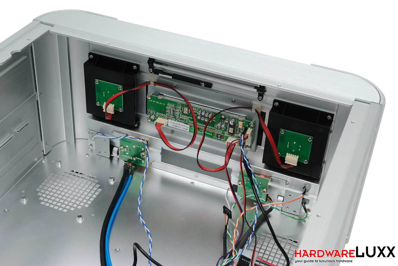 Ist alles entfernt, ist es im CW02 dementsprechend übersichtlich; man kann ungehindert an alle Kabel gelangen. Erst jetzt sind die Öffnungen für die beiden 90-Millimeter-Lüfter erkennbar, zuvor versteckten sie sich noch gut getarnt unter den Einschüben für die Festplatten. Je nach Gusto kann man nun die optionalen Ventilatoren montieren.