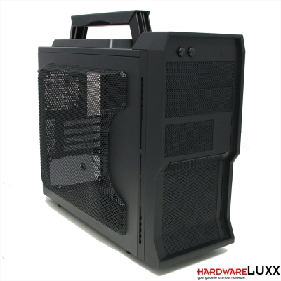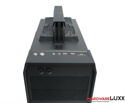 Das I/O-Panel wurde zusammen mit Power- und Resetschalter gut erreichbar auf der vorderen Kunststofferhöhung untergebracht. Mit eSATA, Audio und zweimal USB 2.0 stehen die üblichen Anschlüsse zur Verfügung. Der Tragegriff wird separat verpackt ausgeliefert. Er wird mit vier kleinen Schrauben am Gehäuse befestigt. Für breitere Schraubenzieher (z.B. Multi-Bit-Modelle) ist der Platz zum Schrauben zu eng, hier muss also auf ein schlankes Modell zurückgegriffen werden.