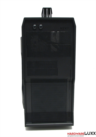 NZXT setzt beim Vulcan auf ein kantiges, industriell wirkendes Design. Damit folgt man der allgemeinen Tendenz, Gamer-Gehäusen eine möglichst brachiale Optik zu verpassen. Auffällig ist der große Tragegriff an der Oberseite, mit dem NZXT den vorgesehen Einsatzzweck als LAN-Gehäuse unterstreicht.