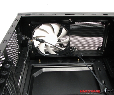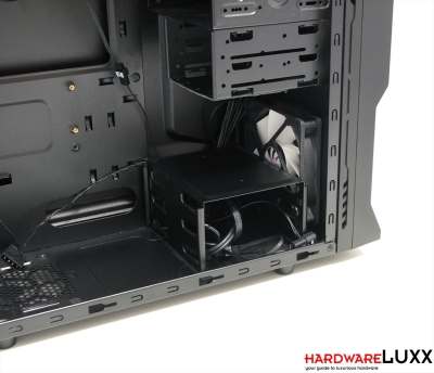 Die beiden internen 3,5-Zoll-Laufwerksplätze befinden sich direkt im Luftstrom des Frontlüfters. Die Laufwerksmontage erfolgt werkzeuglos mit je zwei seitlichen Montageschienen. Ein schlanker Gummiring an diesen Schienen soll die Festplatten entkoppeln, diese Lösung ist allerdings nicht sehr wirkungsvoll. NZXT hat das Gehäuse so konzipiert, dass lange Grafikkarten in den Raum zwischen Festplattenkäfig und den externen Laufwerkskäfigen hineinragen können.
