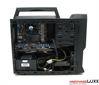 Der Einbau des Systems war trotz der geringen Gehäusegröße kein Problem. Die Festplattenmontage mit den beiden Montageschienen ging leicht von der Hand. Auch der Einbau der sonstigen Hardware war unkompliziert. Die lange Radeon HD 5830 ragt etwas unter den Käfig der externen 3,5-Zoll-Laufwerke. Das Konzept mit dem Freiraum zwischen den Laufwerkskäfigen geht also auf, die Montage langer Grafikkarten ist möglich (Details dazu weiter unten).